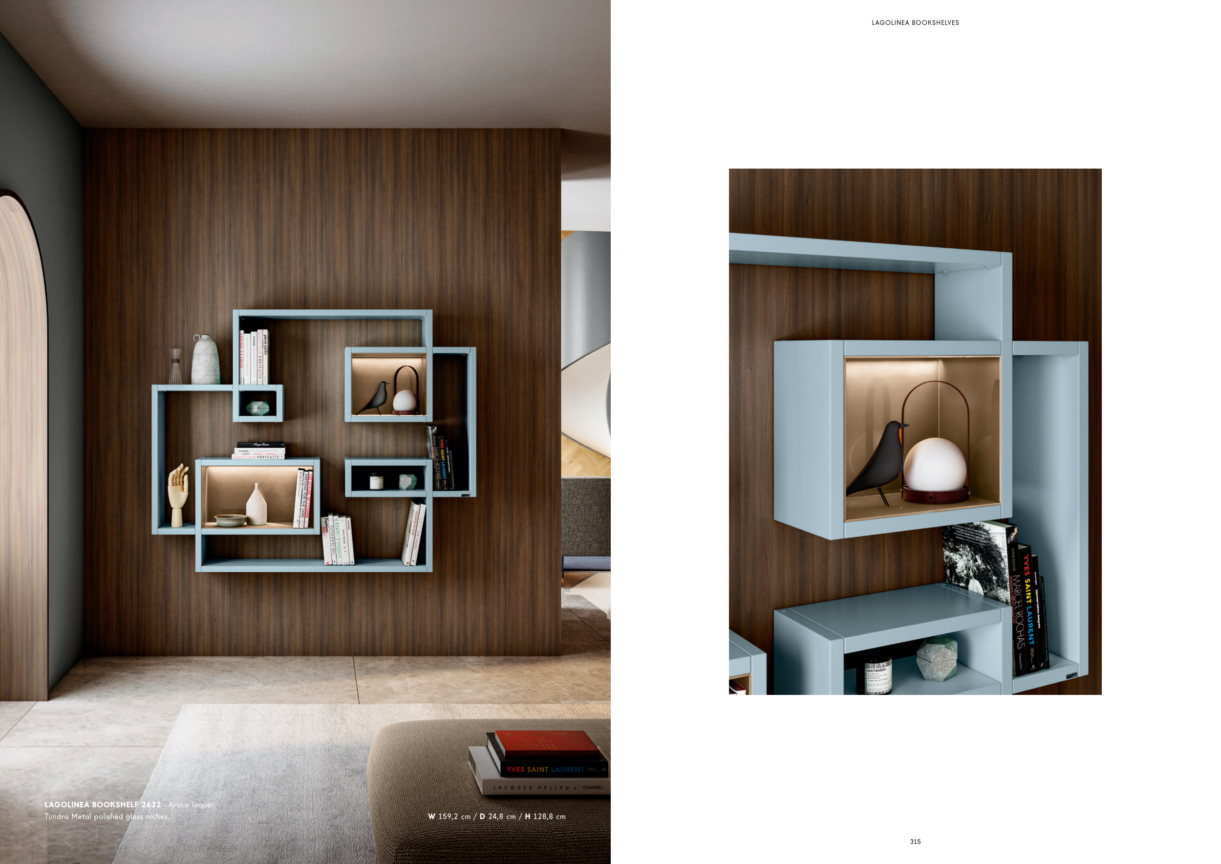 LAGO LIVING 314 315 LAGOLINEA BOOKSHELF 2632 - Artico laquer. Tundra Metal polished glass niches. W 159,2 cm / D 24,8 cm / H 128,8 cm LAGOLINEA BOOKSHELVES