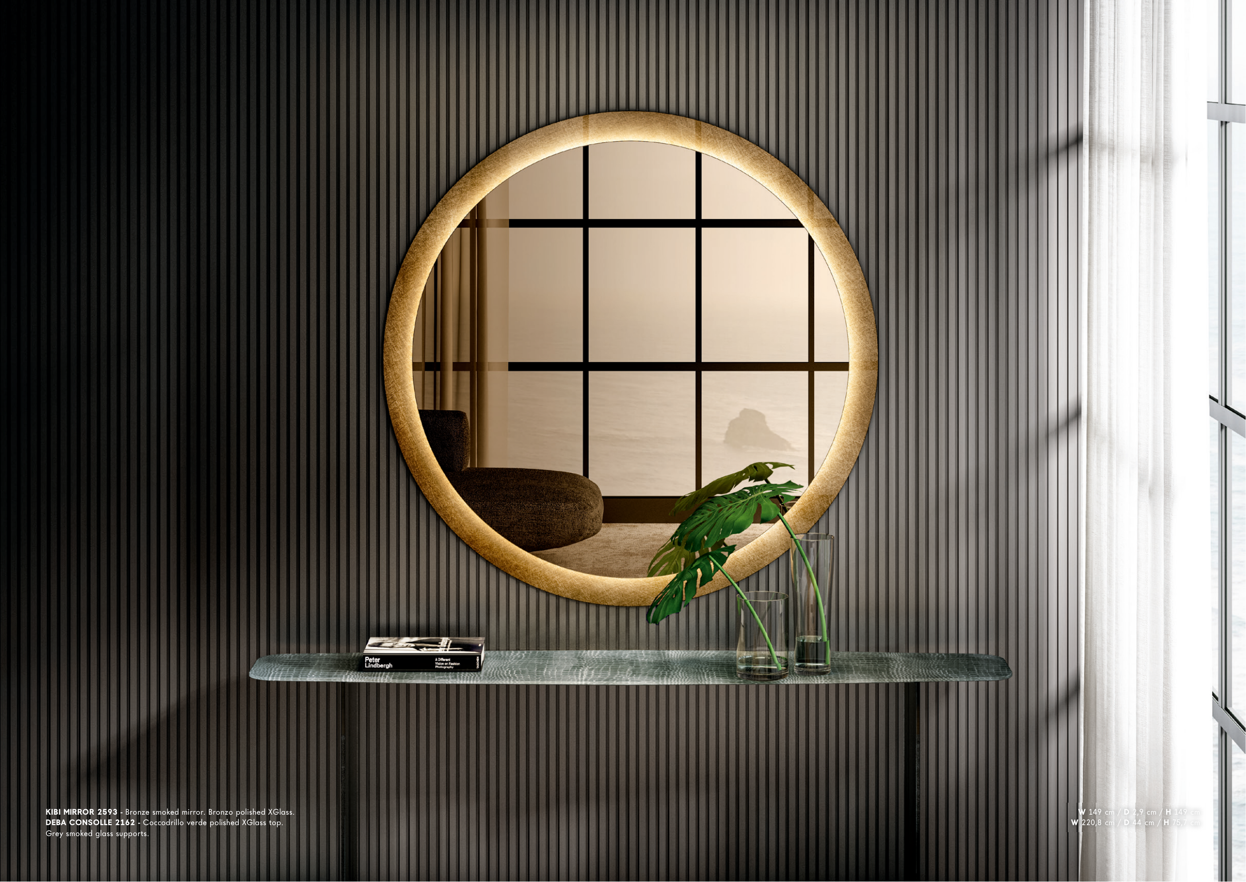 LAGO LIVING 410 411 KIBI MIRROR 2593 - Bronze smoked mirror. Bronzo polished XGlass. DEBA CONSOLLE 2162 - Coccodrillo verde polished XGlass top. Grey smoked glass supports. W 149 cm / D 2,9 cm / H 149 cm W 220,8 cm / D 44 cm / H 75,7 cm