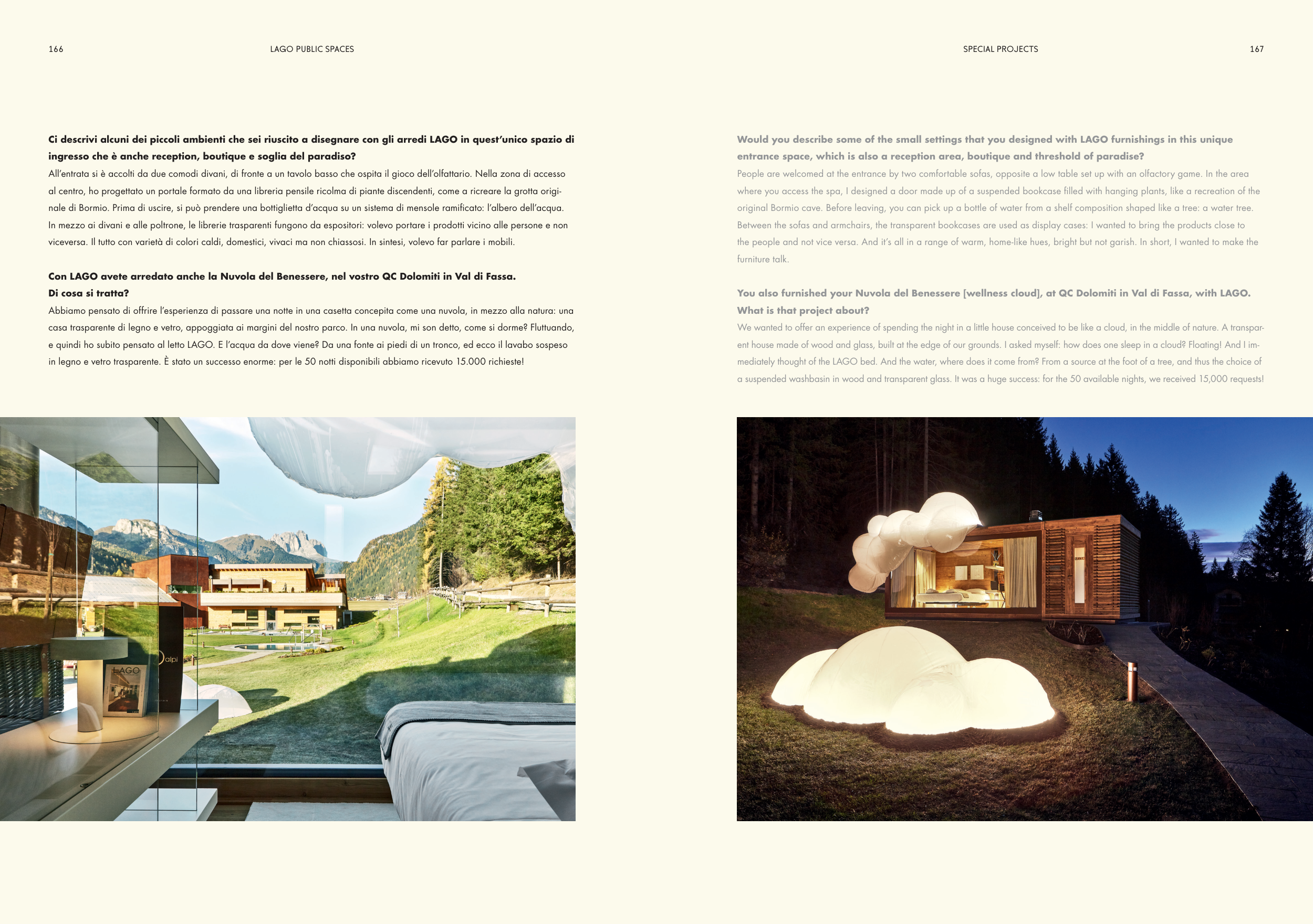 You also furnished your Nuvola del Benessere [wellness cloud], at QC Dolomiti in Val di Fassa, with LAGO.
