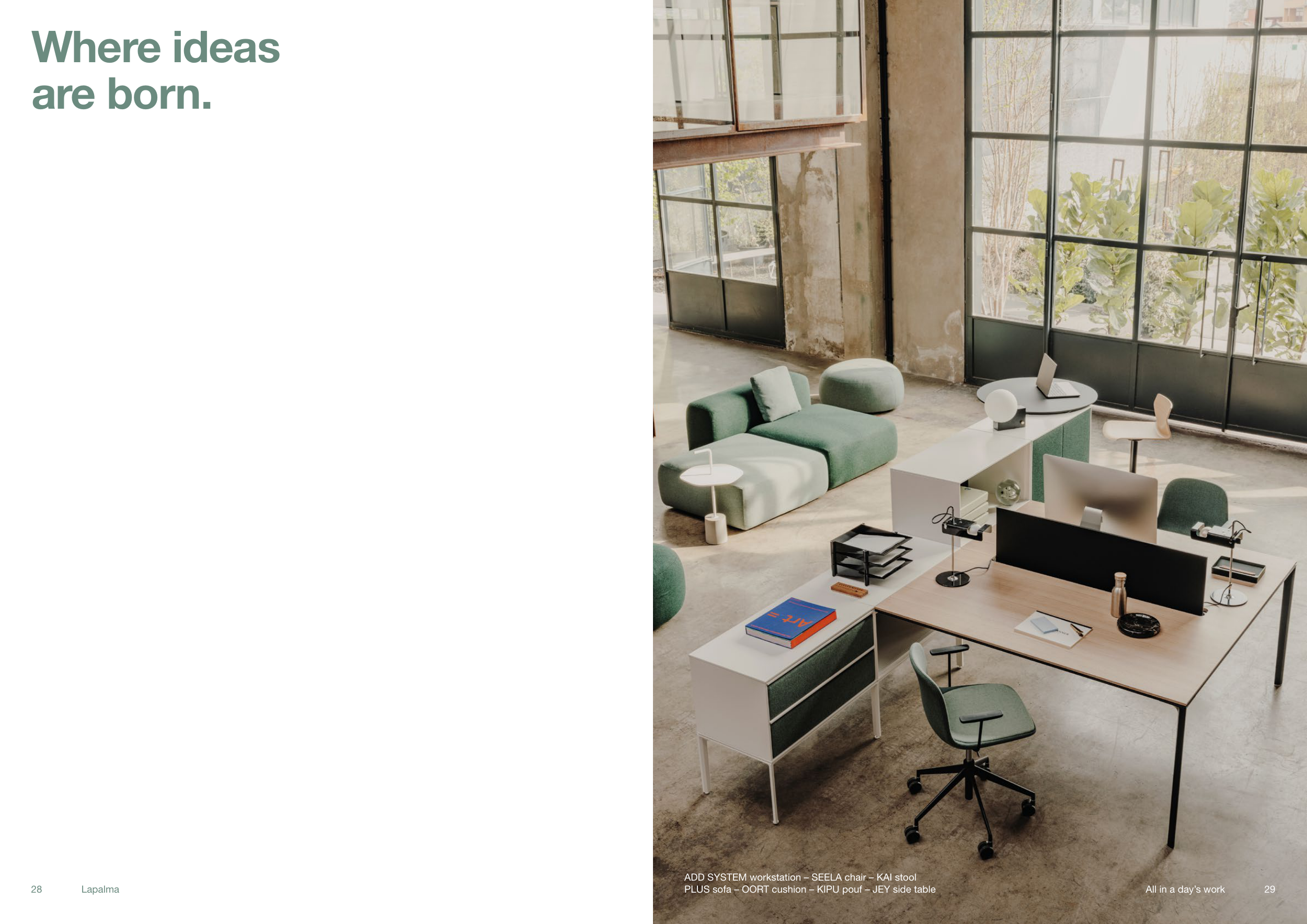 All in a day’s work 29 28 Lapalma 29 Where ideas are born. All in a day’s work ADD SYSTEM workstation – SEELA chair – KAI stool PLUS sofa – OORT cushion – KIPU pouf – JEY side table