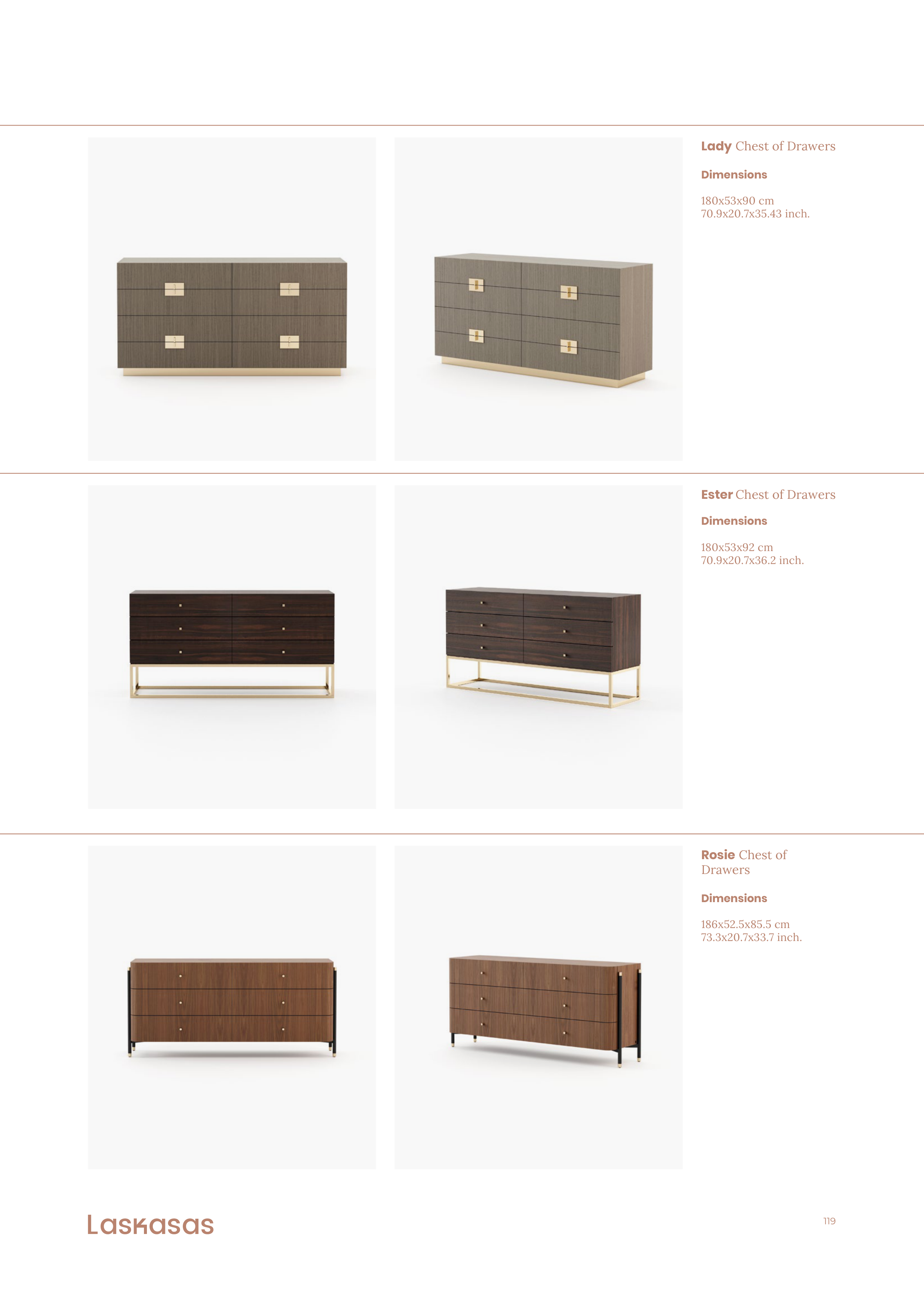 119 Lady Chest of Drawers Dimensions 180x53x90 cm 70.9x20.7x35.43 inch. Ester Chest of Drawers Dimensions 180x53x92 cm 70.9x20.7x36.2 inch. Rosie Chest of Drawers Dimensions 186x52.5x85.5 cm 73.3x20.7x33.7 inch.
