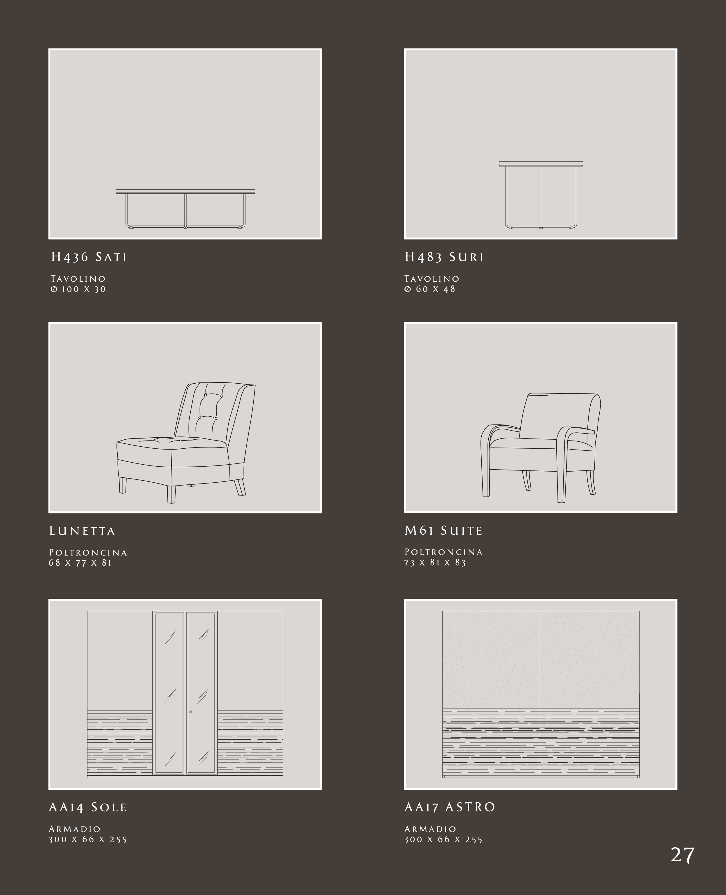 27 M61 Suite Poltroncina 73 x 81 x 83 A A14 Sole Armadio 300 x 66 x 255 H436 Sati Tavolino ø 100 x 30 H483 Suri Tavolino ø 60 x 48 A A17 ASTRO Armadio 300 x 66 x 255 Lunetta Poltroncina 68 x 77 x 81