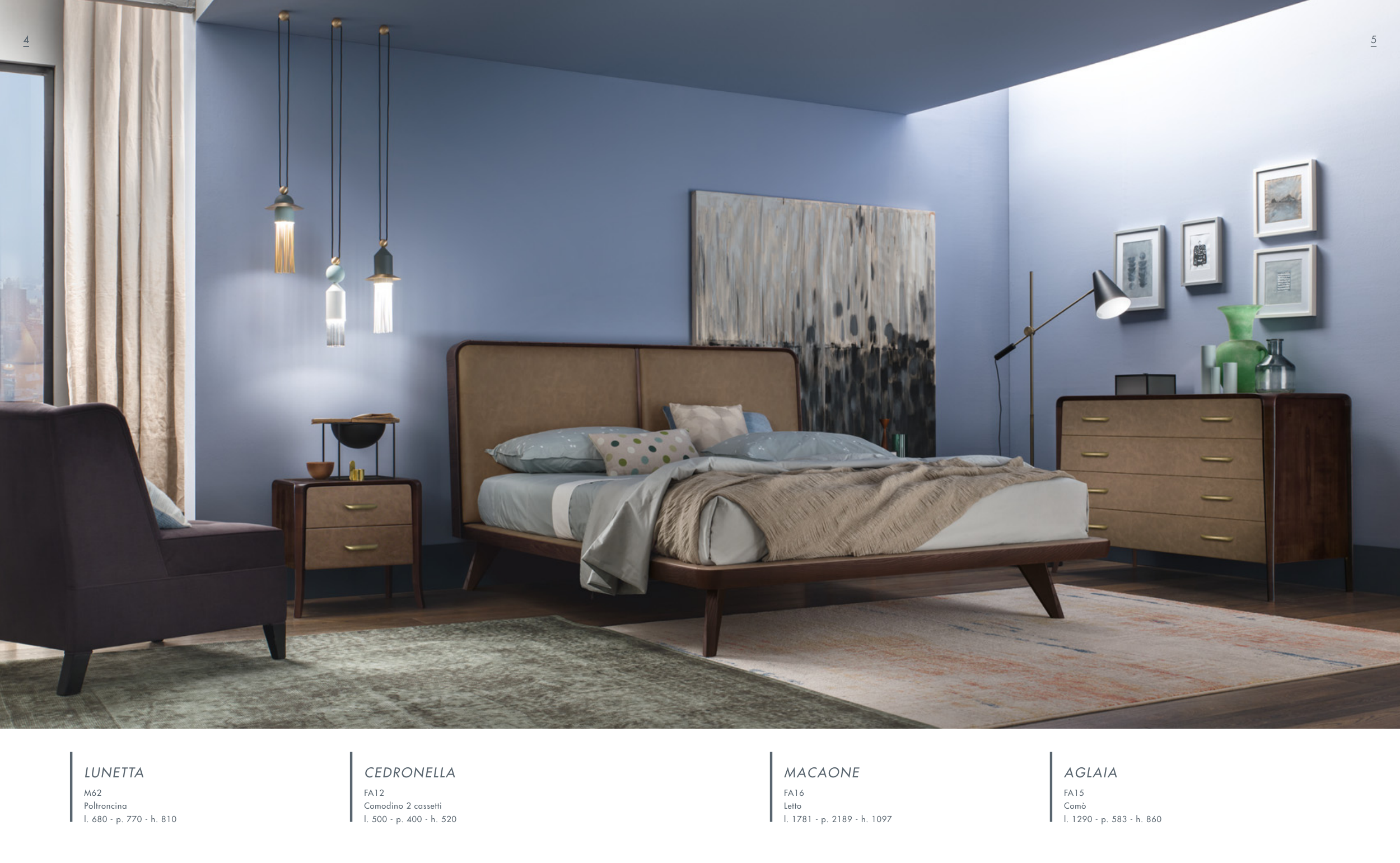 FA16 Letto l. 1781 - p. 2189 - h. 1097 MACAONE FA15 Comò l. 1290 - p. 583 - h. 860 AGLAIA FA12 Comodino 2 cassetti l. 500 - p. 400 - h. 520 CEDRONELLA M62 Poltroncina l. 680 - p. 770 - h. 810 LUNETTA 4 5 4 5