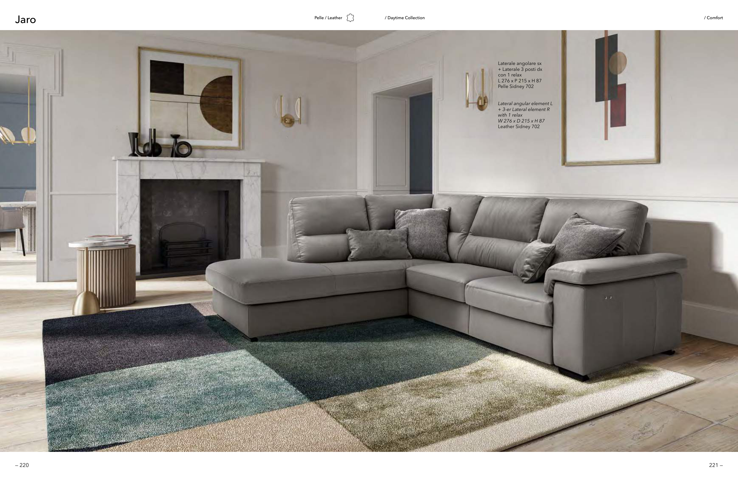 Jaro Pelle / Leather / Daytime Collection Laterale angolare sx + Laterale 3 posti dx con 1 relax L 276 x P 215 x H 87 Pelle Sidney 702 Lateral angular element L + 3-er Lateral element R with 1 relax W 276 x D 215 x H 87 Leather Sidney 702 / Comfort — 220 221 —