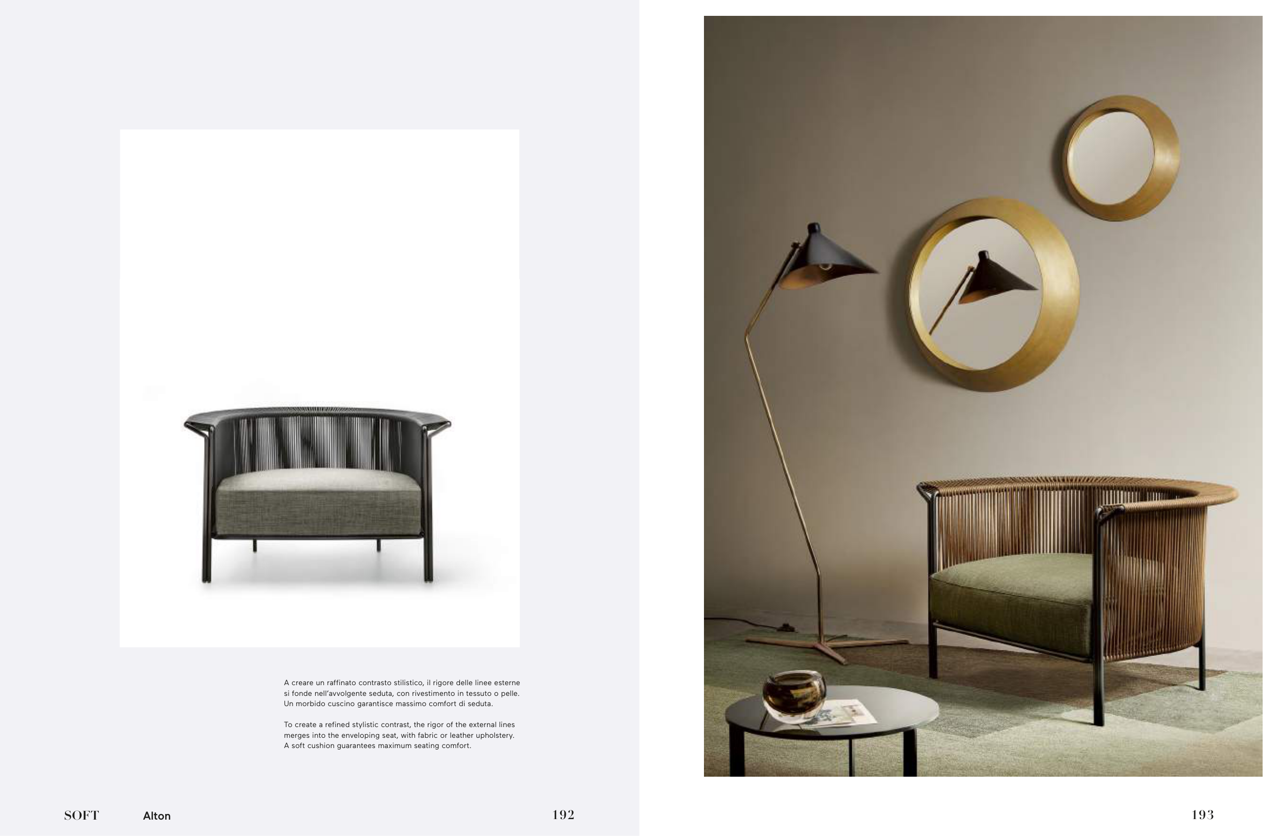 si fonde nell’avvolgente seduta, con rivestimento in tessuto o pelle.