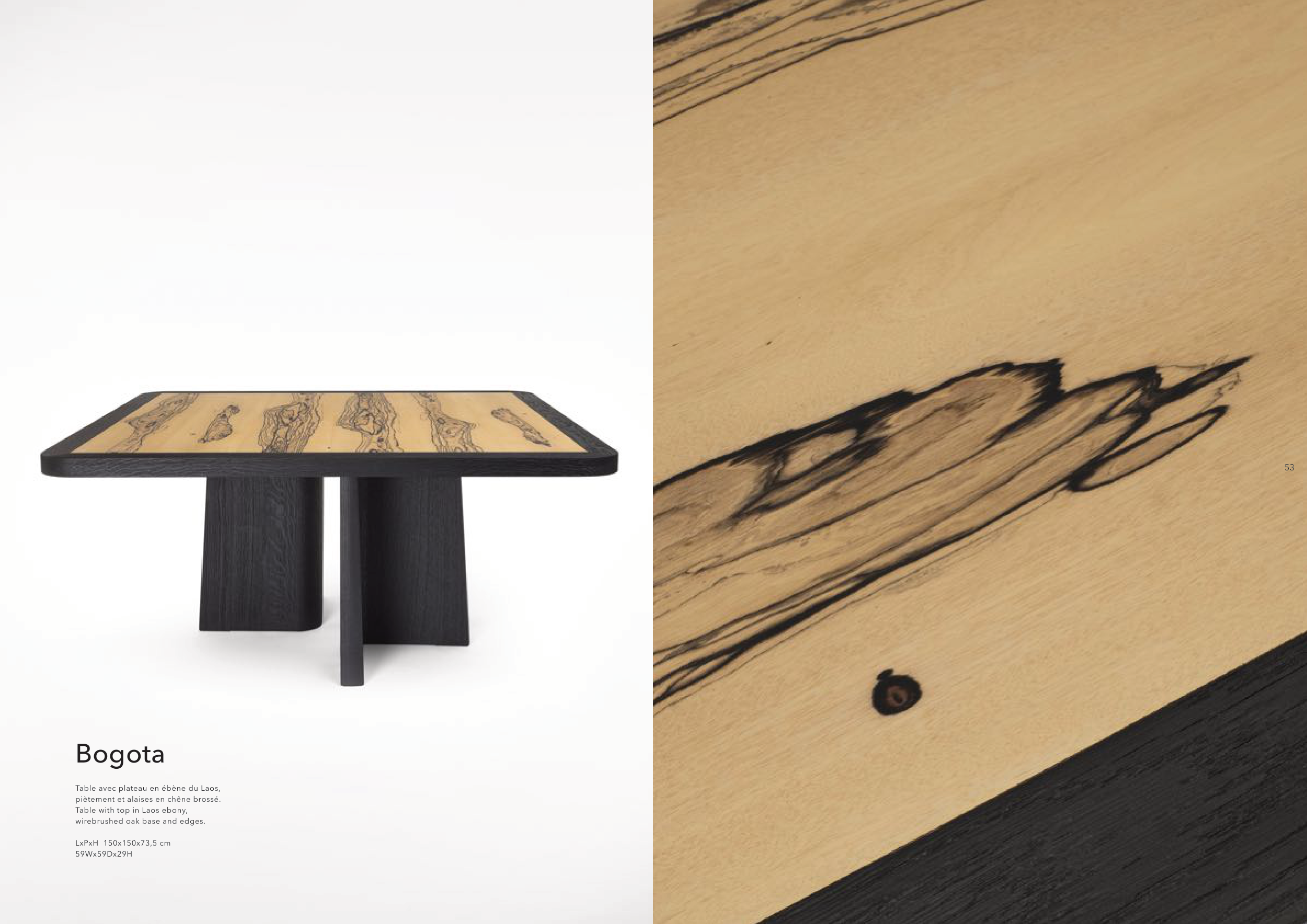 52 53 Bogota Table avec plateau en ébène du Laos, piètement et alaises en chêne brossé. Table with top in Laos ebony, wirebrushed oak base and edges. LxPxH 150x150x73,5 cm 59Wx59Dx29H 53
