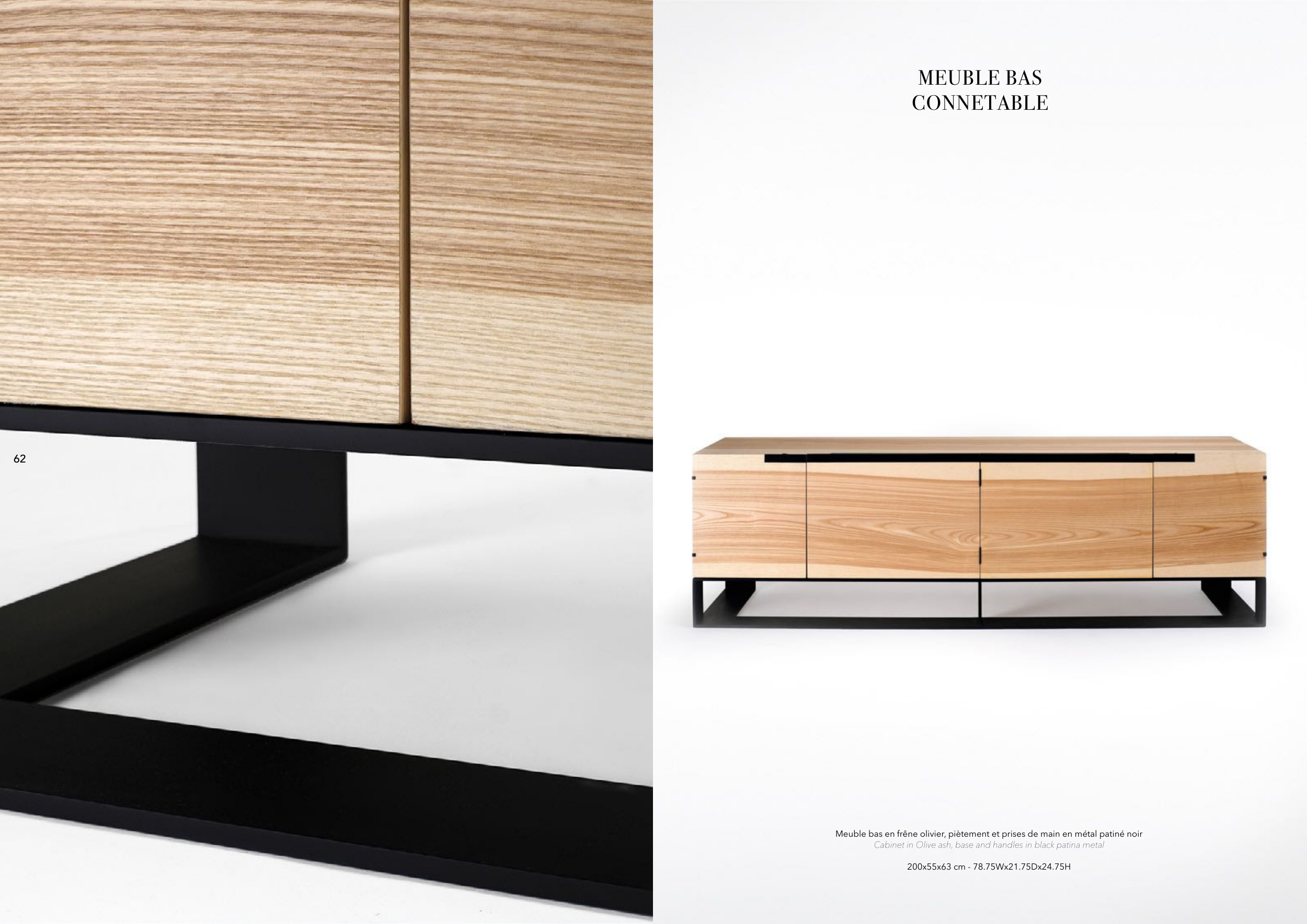 MEUBLE BAS CONNETABLE Meuble bas en frêne olivier, piètement et prises de main en métal patiné noir Cabinet in Olive ash, base and handles in black patina metal 200x55x63 cm - 78.75Wx21.75Dx24.75H 62