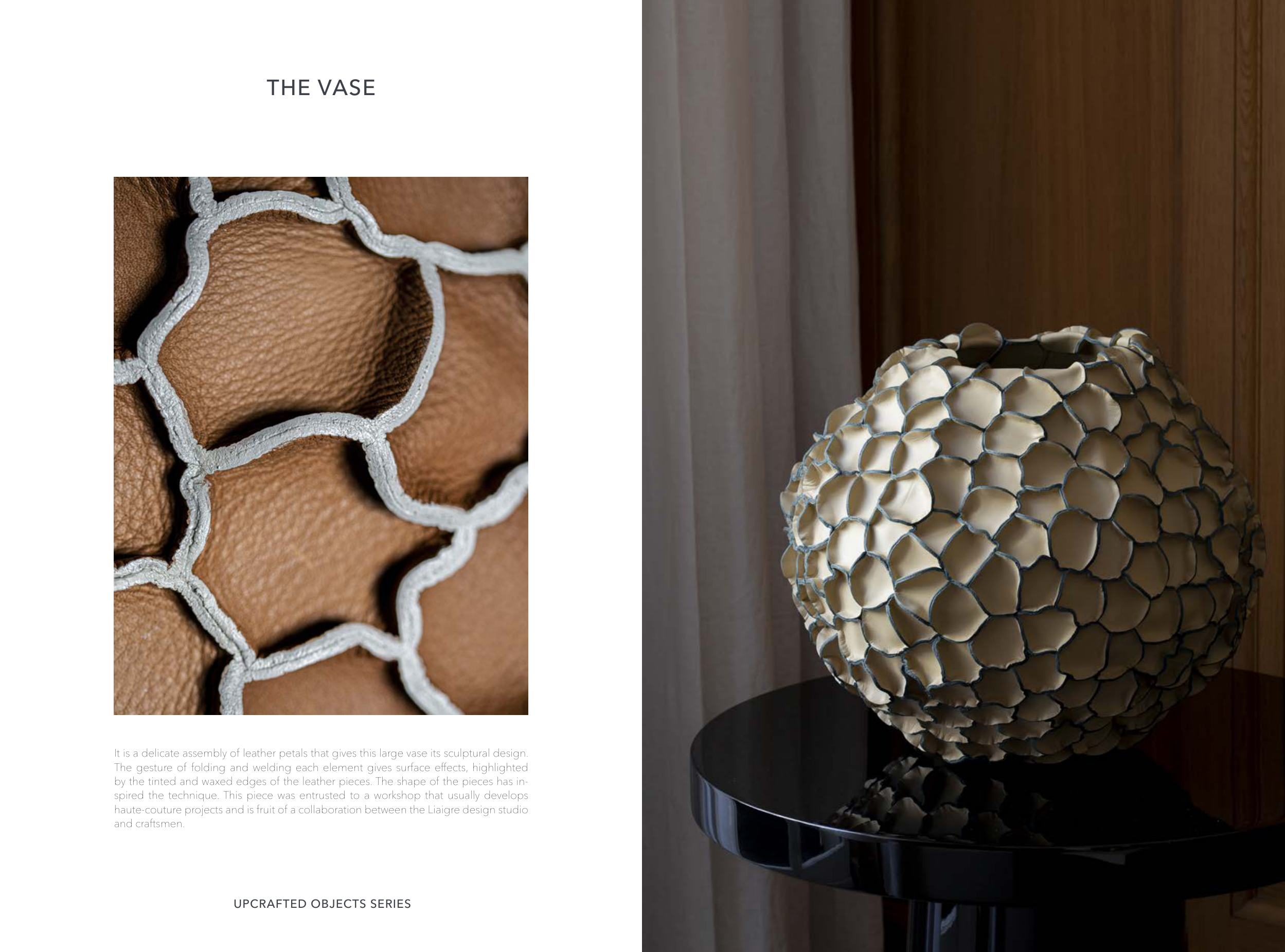It is a delicate assembly of leather petals that gives this large vase its sculptural design.