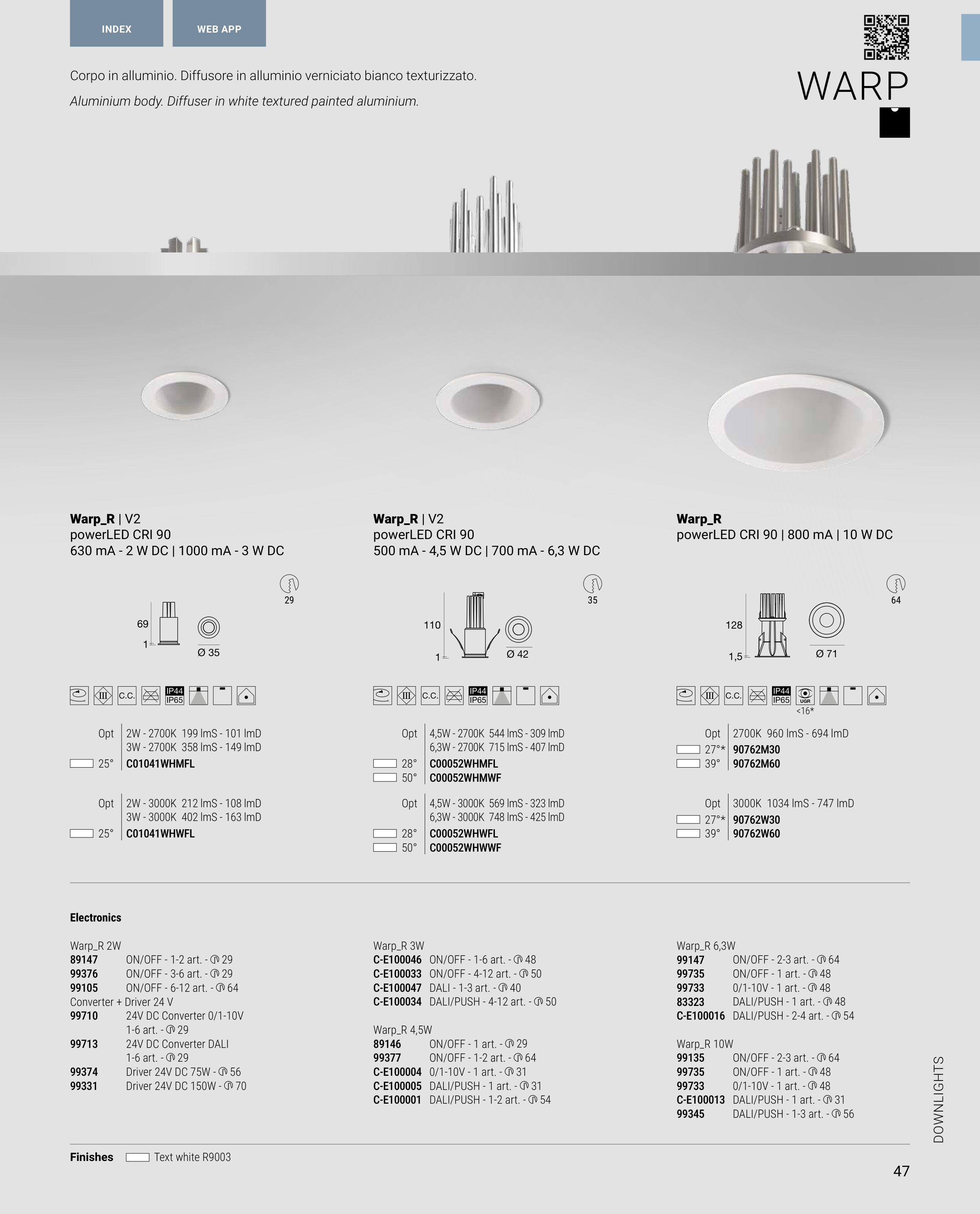 Aluminium body. Diffuser in white textured painted aluminium.