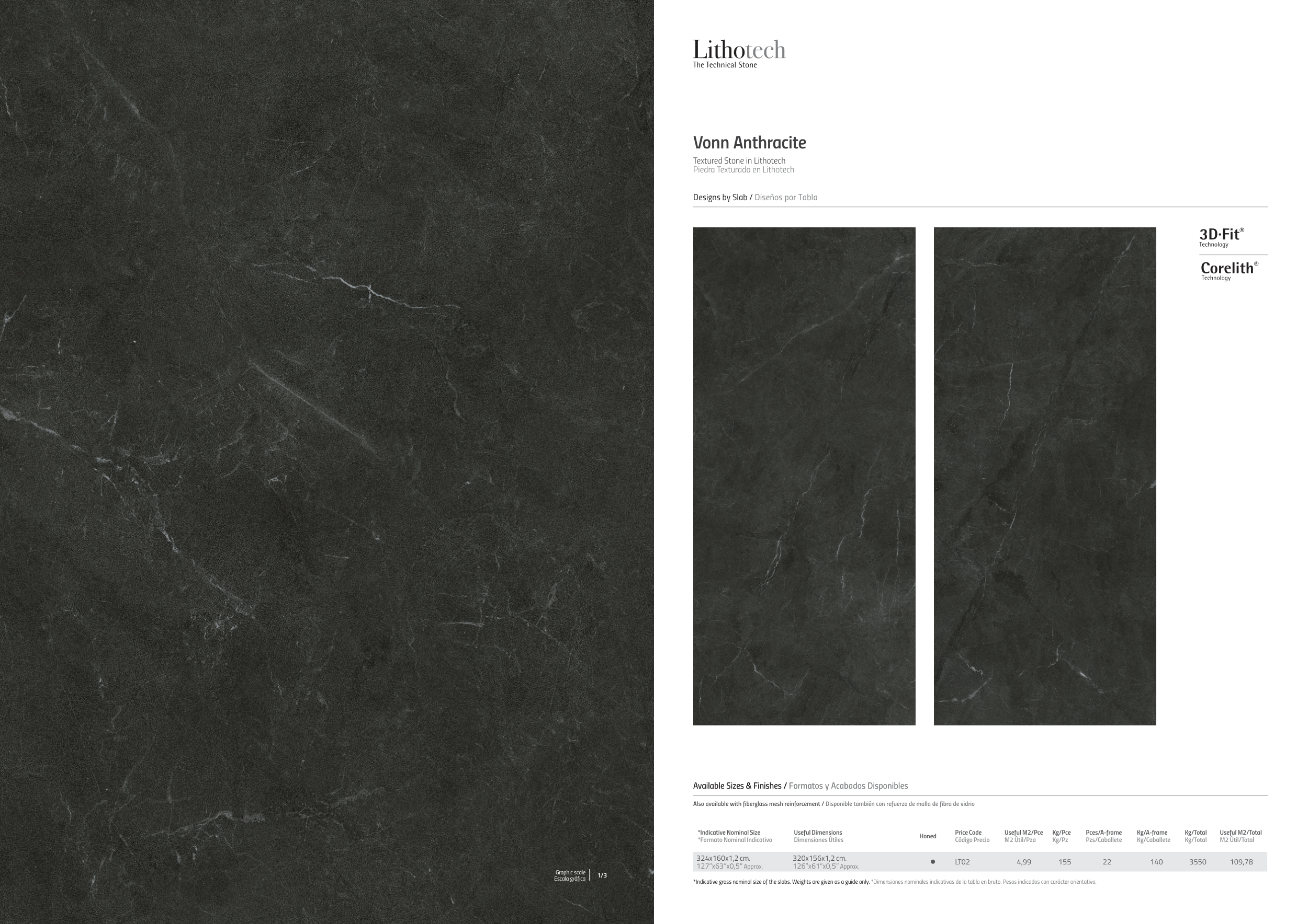 *Indicative gross nominal size of the slabs. Weights are given as a guide only. *Dimensiones nominales indicativas de la tabla en bruto. Pesos indicados con carácter orientativo.