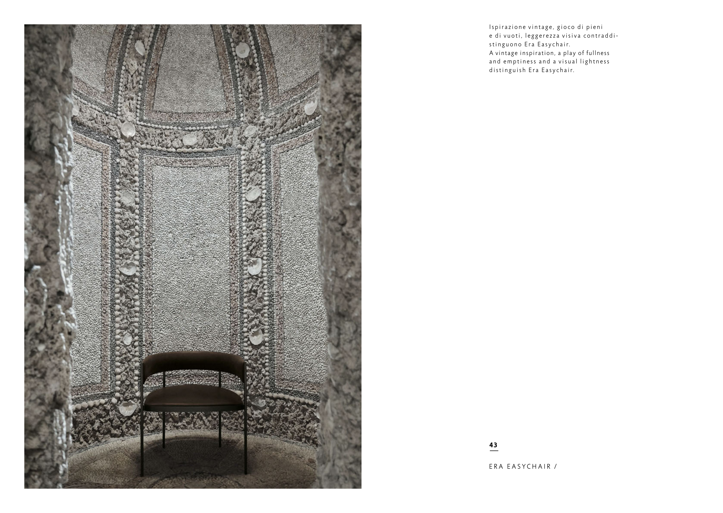 43 E R A E A S Y C H A I R / Ispirazione vintage, gioco di pieni e di vuoti, leggerezza visiva contraddi- stinguono Era Easychair. A vintage inspiration, a play of fullness and emptiness and a visual lightness distinguish Era Easychair.