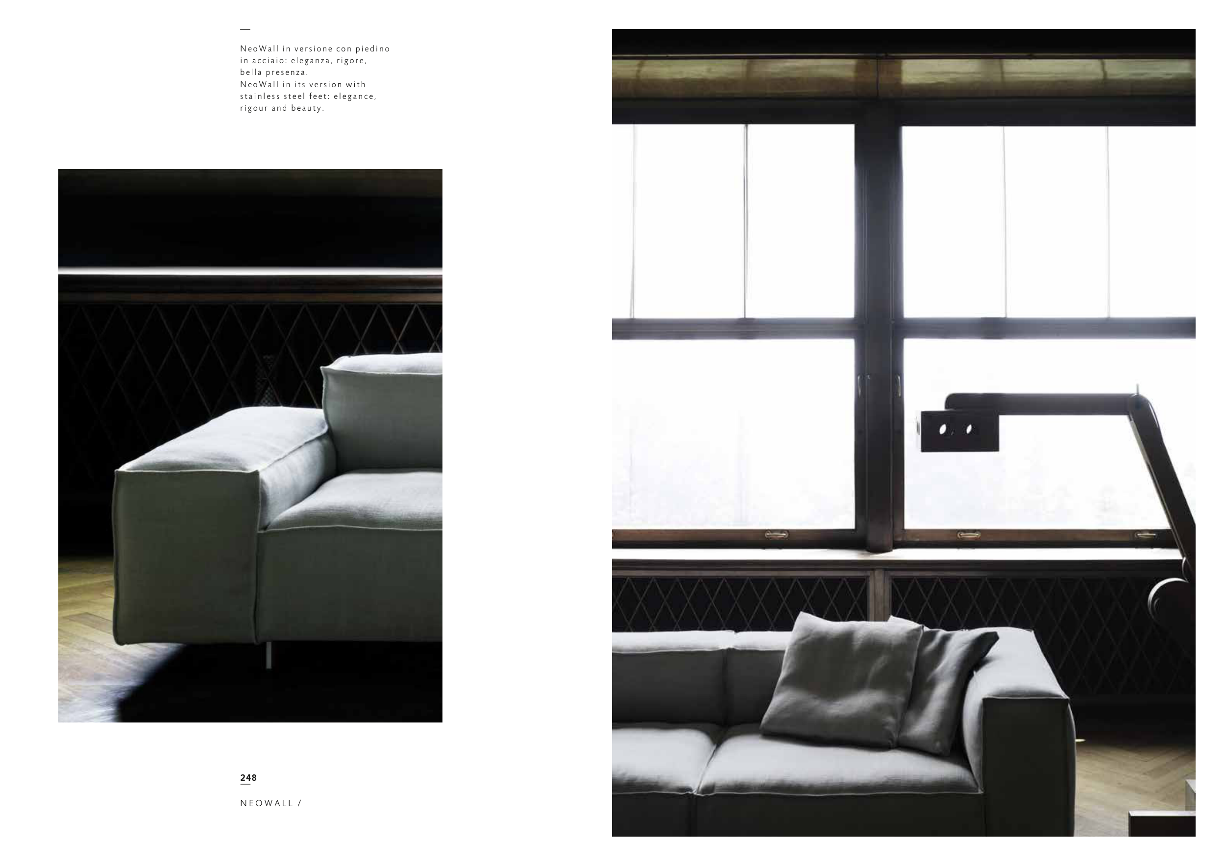 248 Neo Wall in ve r sion e con p ie d in o in ac ciaio: e le g an za, r ig ore , bel l a p r e se n za. Neo Wall in its ve r sion w ith s t a i n l e s s s t e e l f e e t : e l e g a n c e , rigo ur an d b e auty. N E O W A L L /