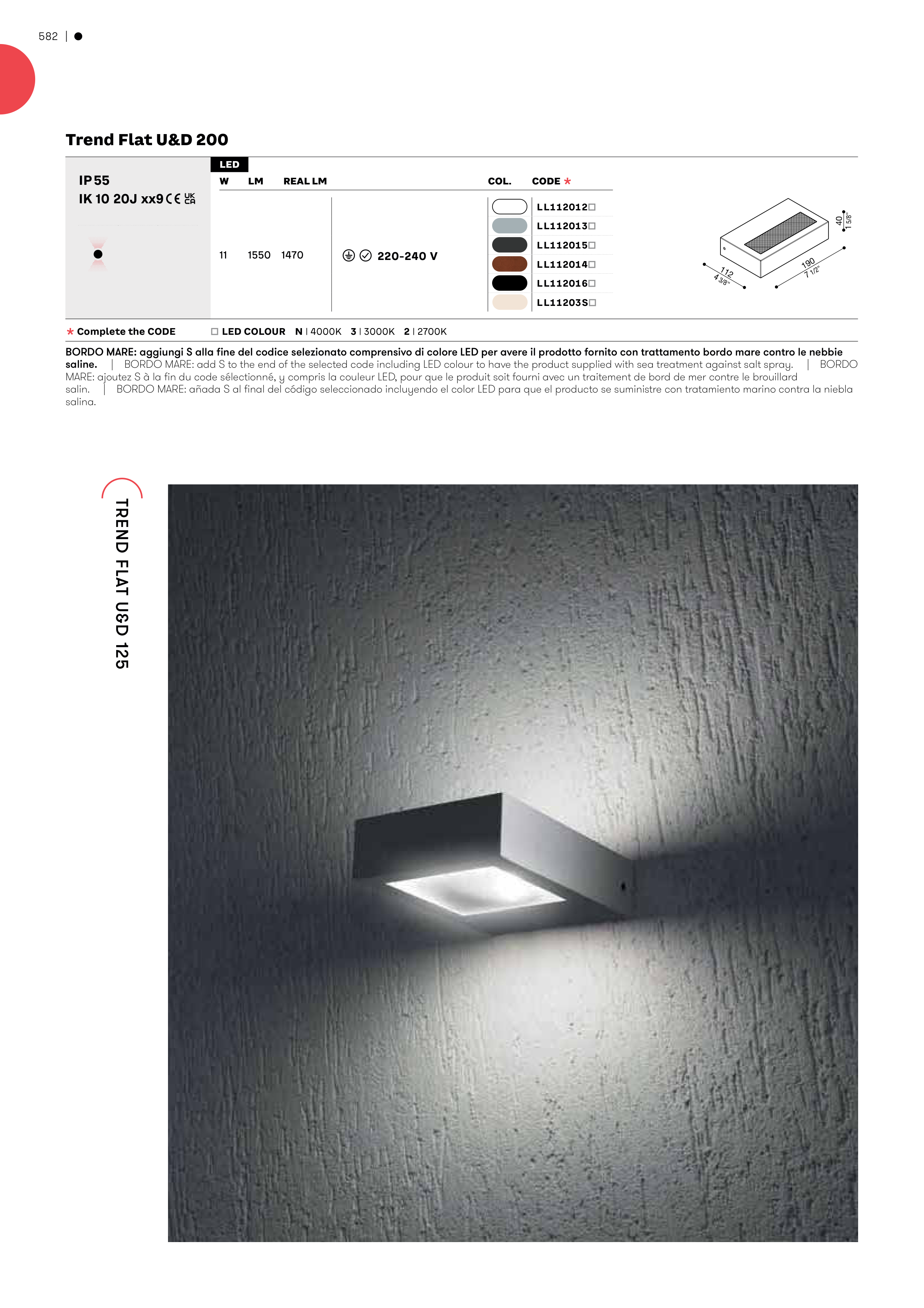 BORDO MARE: aggiungi S alla fine del codice selezionato comprensivo di colore LED per avere il prodotto fornito con trattamento bordo mare contro le nebbie