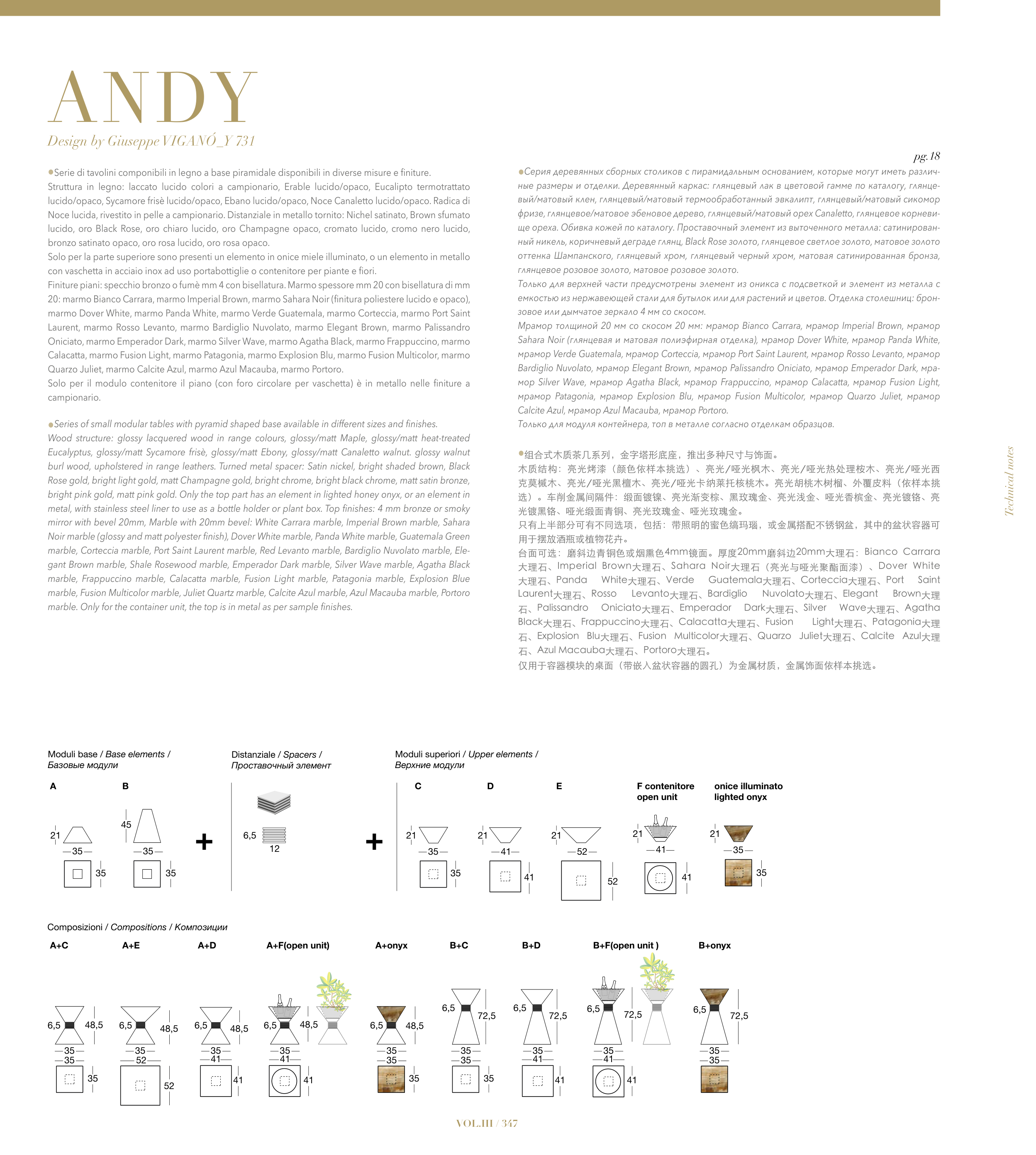 •Series of small modular tables with pyramid shaped base available in different sizes and finishes.