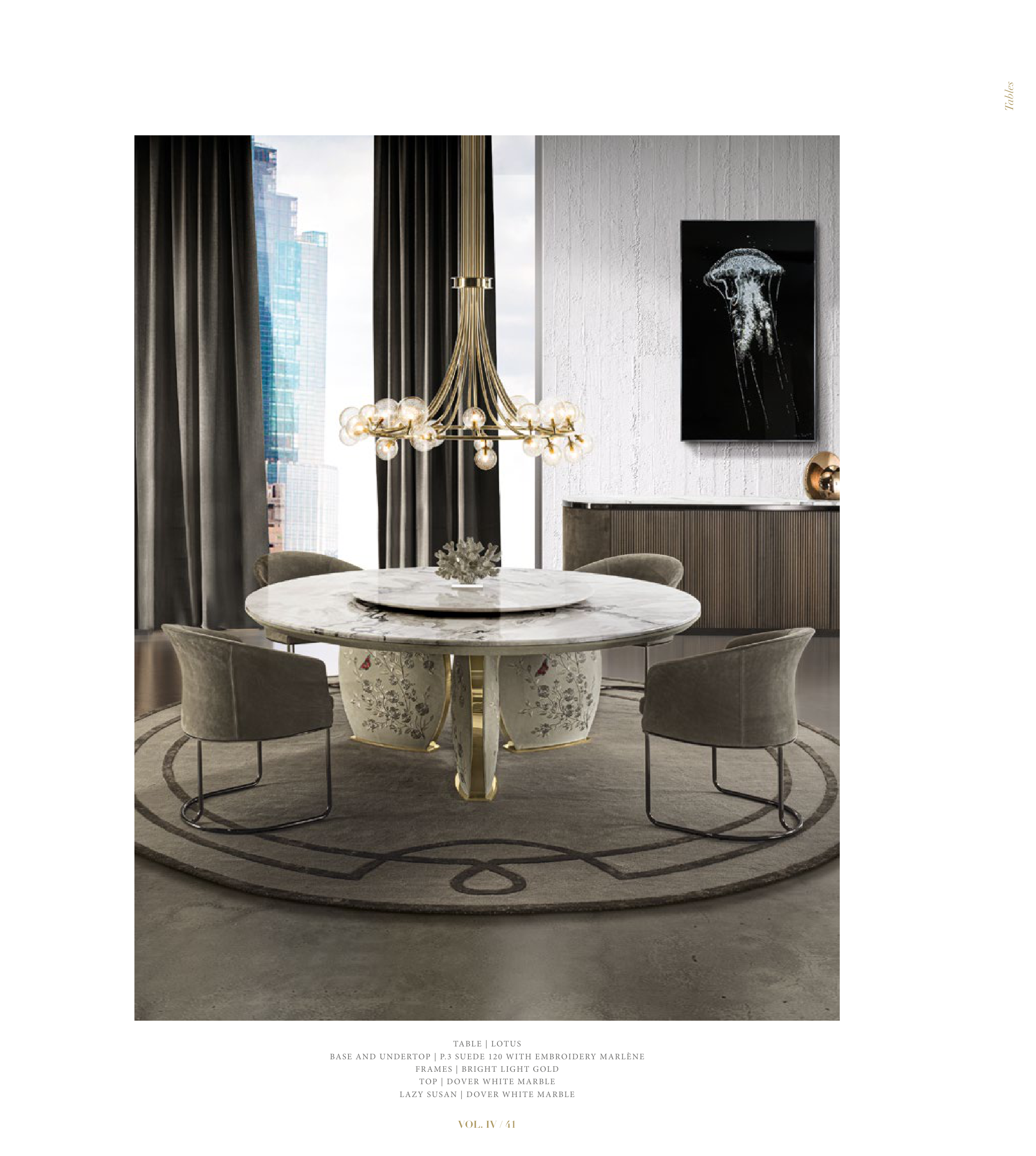 TABLE | LOTUS BASE AND UNDERTOP | P.3 SUEDE 120 WITH EMBROIDERY MARLÈNE FRAMES | BRIGHT LIGHT GOLD TOP | DOVER WHITE MARBLE LAZY SUSAN | DOVER WHITE MARBLE Tables VOL. IV / 41