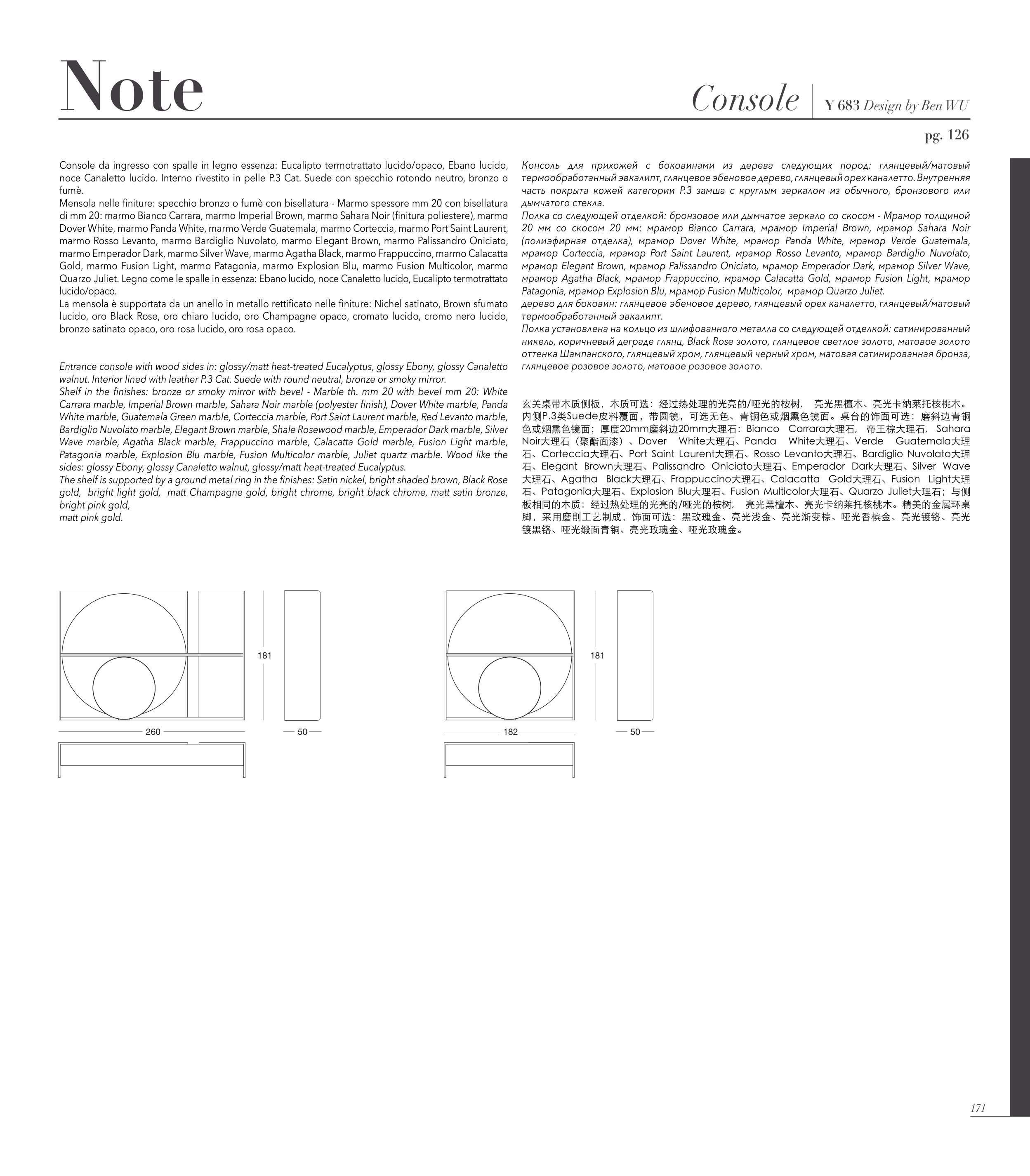 内侧P.3类Suede皮料覆面,带圆镜,可选无色、青铜色或烟熏色镜面。桌台的饰面可选:磨斜边青铜