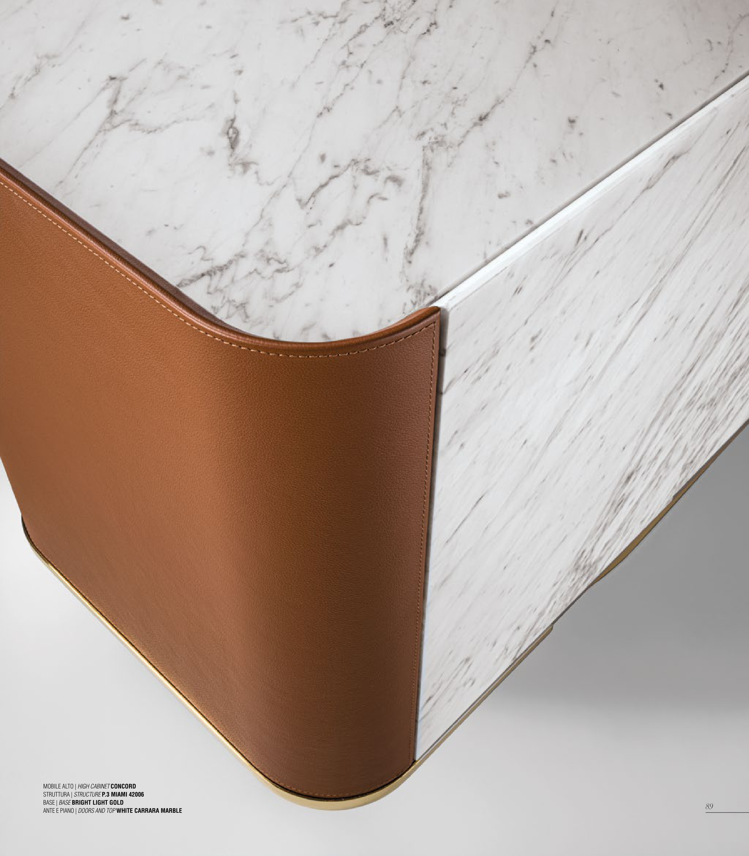 MOBILE ALTO | HIGH CABINET CONCORD STRUTTURA | STRUCTURE P.3 MIAMI 42006 BASE | BASE BRIGHT LIGHT GOLD ANTE E PIANO | DOORS AND TOP WHITE CARRARA MARBLE 89