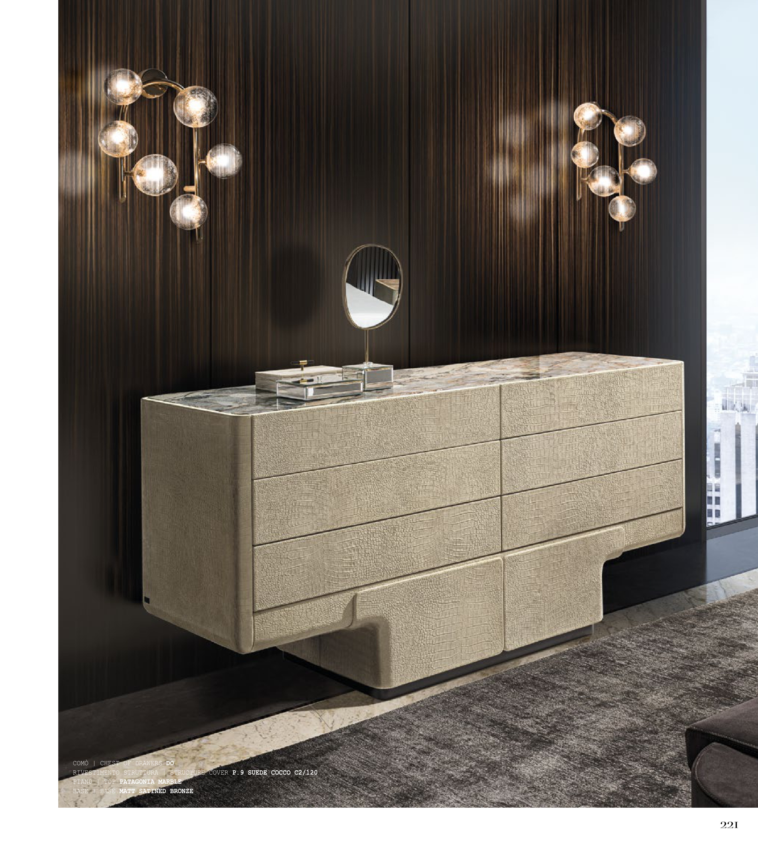 221 COMÒ | CHEST OF DRAWERS DO RIVESTIMENTO STRUTTURA | STRUCTURE COVER P.9 SUEDE COCCO C2/120 PIAN0 | TOP PATAGONIA MARBLE BASE | BASE MATT SATINED BRONZE