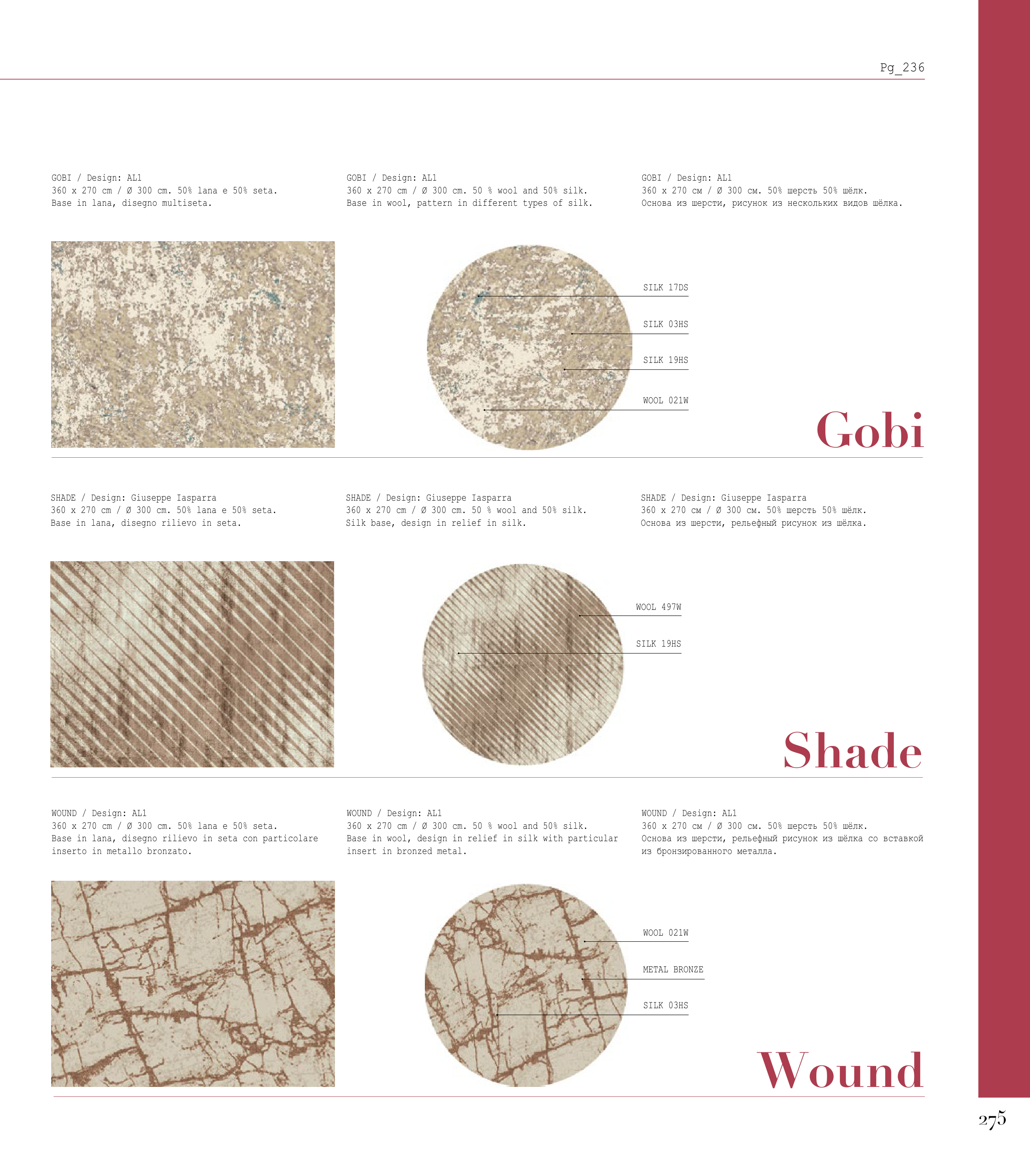 360 x 270 cm / Ø 300 cm. 50% lana e 50% seta.