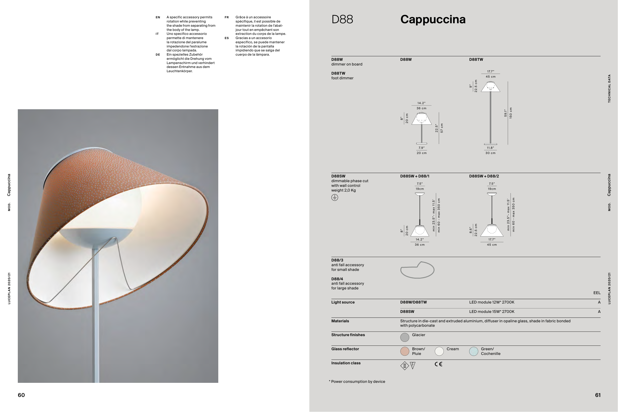 Structure in die-cast and extruded aluminium, diffuser in opaline glass, shade in fabric bonded