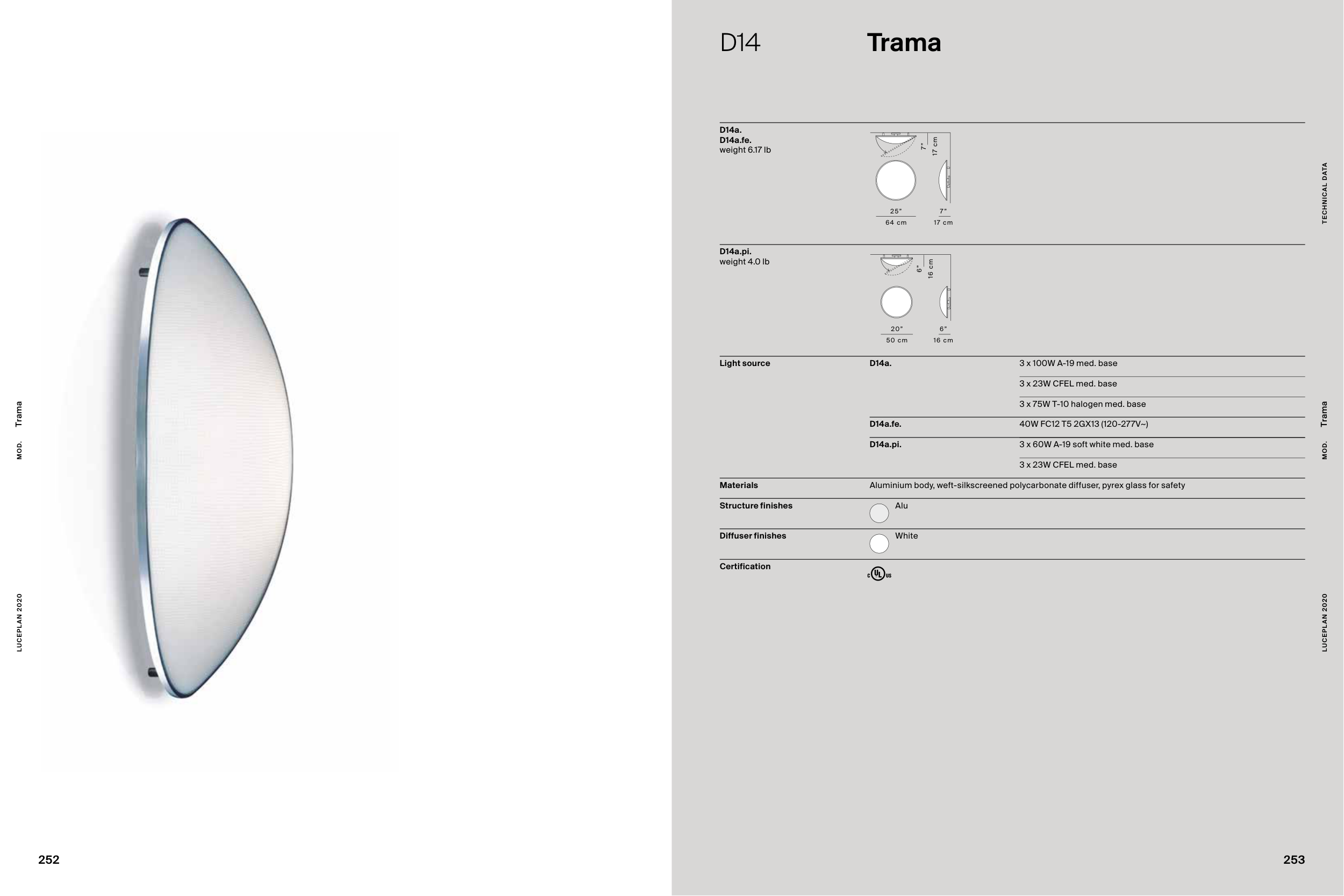 Aluminium body, weft-silkscreened polycarbonate diffuser, pyrex glass for safety