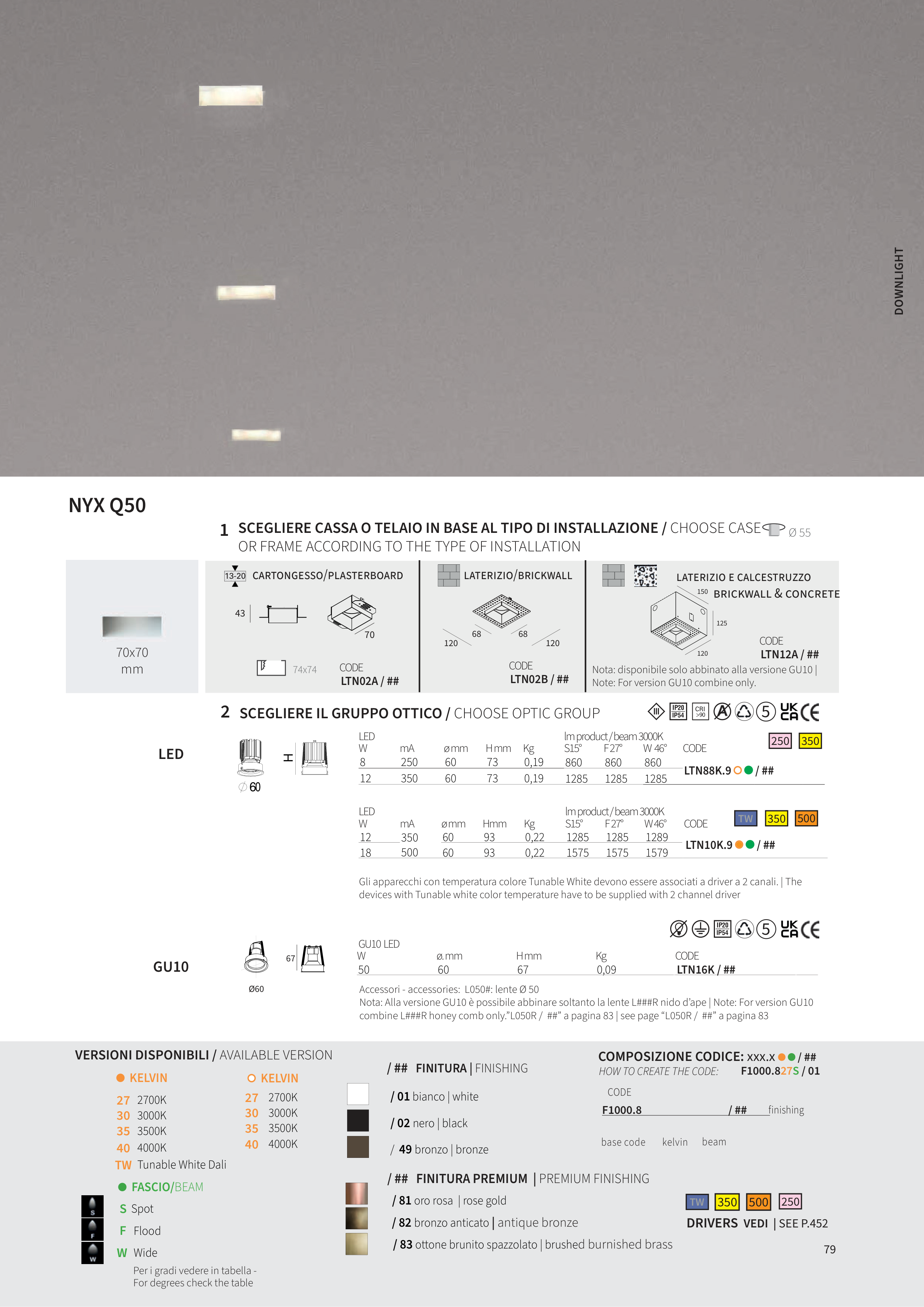 Nota: Alla versione GU10 è possibile abbinare soltanto la lente L###R nido d’ape | Note: For version GU10
