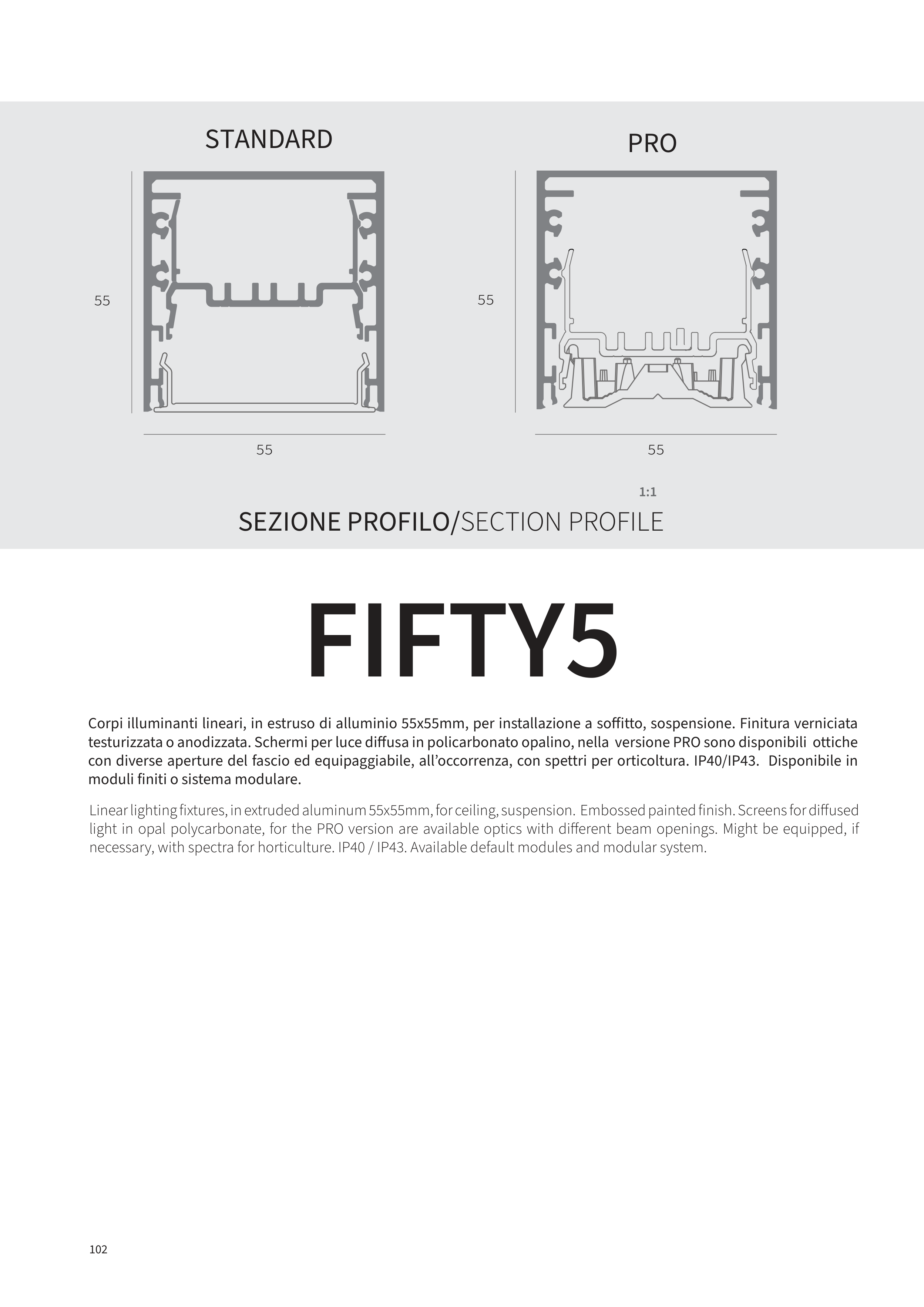 testurizzata o anodizzata. Schermi per luce diffusa in policarbonato opalino, nella versione PRO sono disponibili ottiche