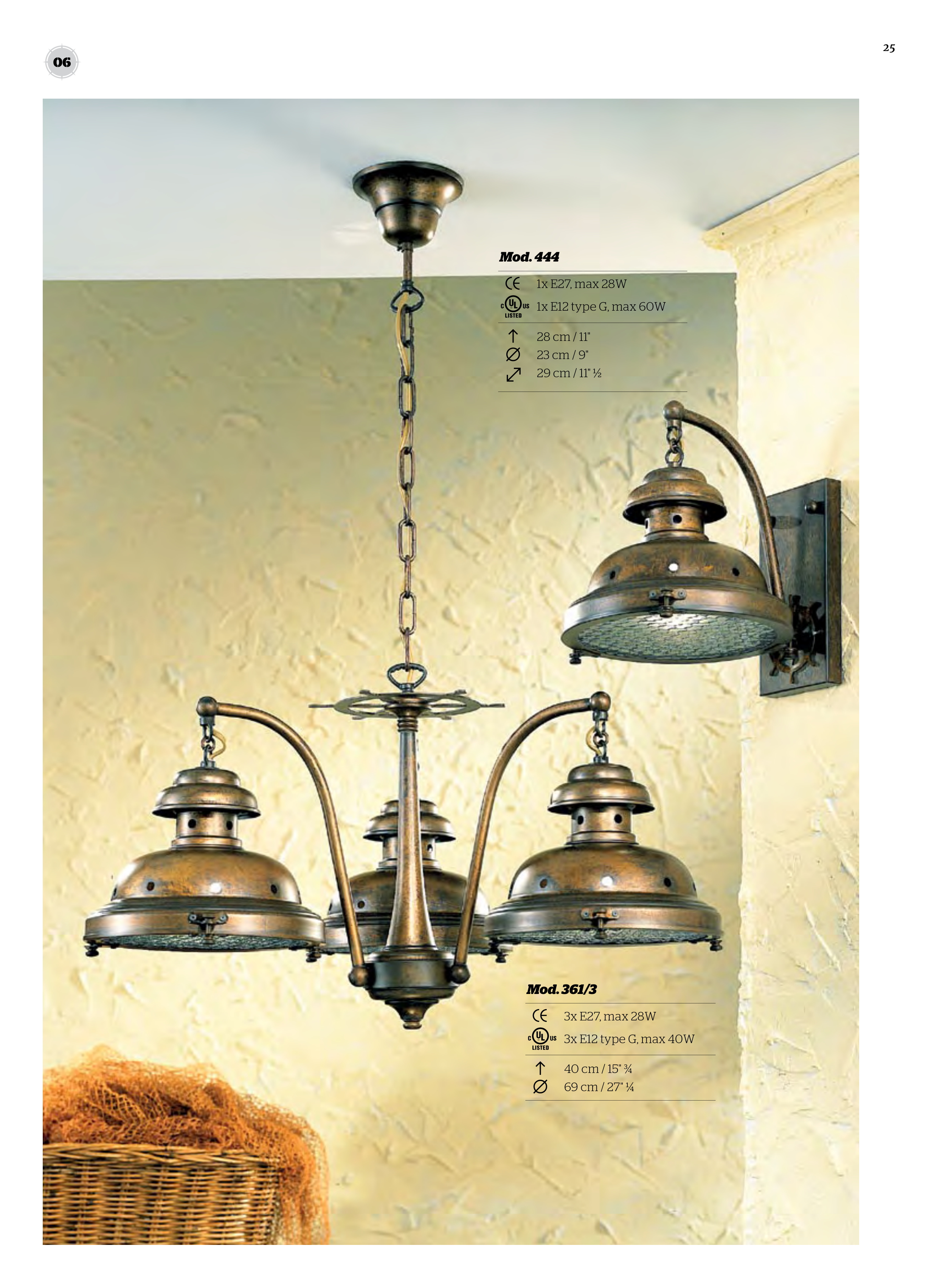3x E27, max 28W 3x E12 type G, max 40W Mod. 361/3 40 cm / 15" ¾ 69 cm / 27" ¼ 1x E27, max 28W 1x E12 type G, max 60W Mod. 444 28 cm / 11" 23 cm / 9" 29 cm / 11" ½ 06 25