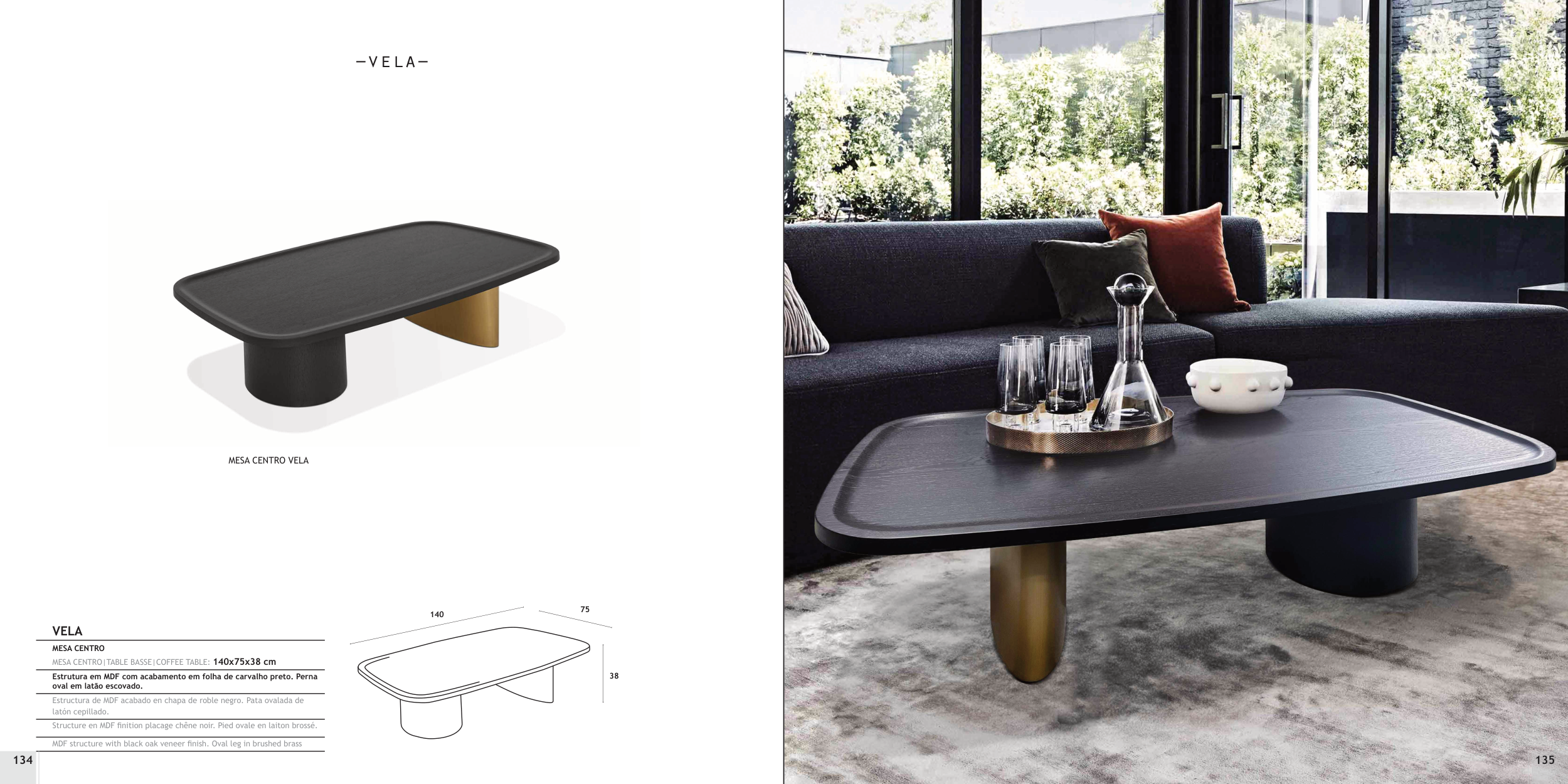 MDF structure with black oak veneer finish. Oval leg in brushed brass