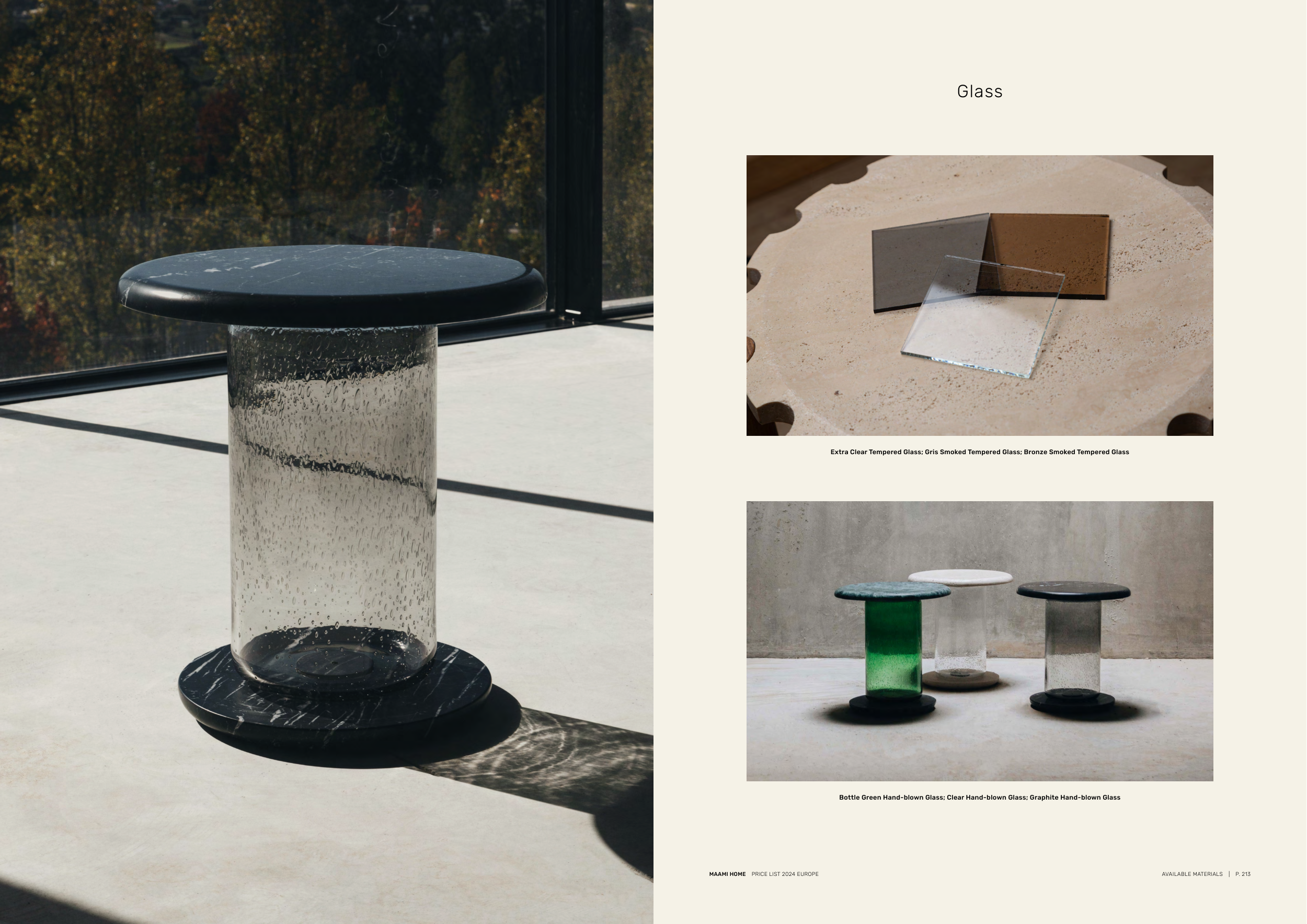 Glass Extra Clear Tempered Glass; Gris Smoked Tempered Glass; Bronze Smoked Tempered Glass Bottle Green Hand-blown Glass; Clear Hand-blown Glass; Graphite Hand-blown Glass MAAMI HOME PRICE LIST 2024 EUROPE AVAILABLE MATERIALS | P. 213