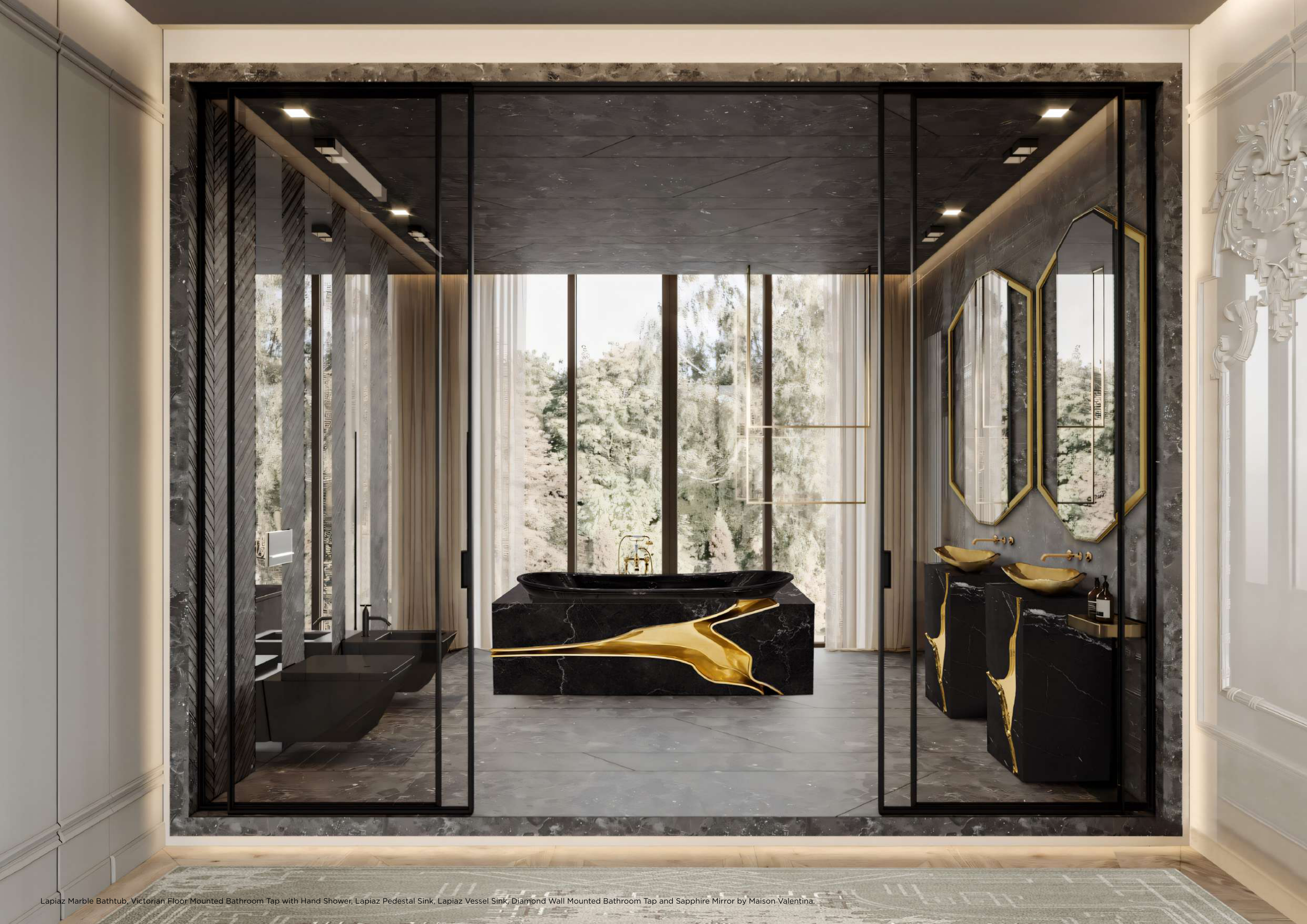 Lapiaz Marble Bathtub, Victorian Floor Mounted Bathroom Tap with Hand Shower, Lapiaz Pedestal Sink, Lapiaz Vessel Sink, Diamond Wall Mounted Bathroom Tap and Sapphire Mirror by Maison Valentina.
