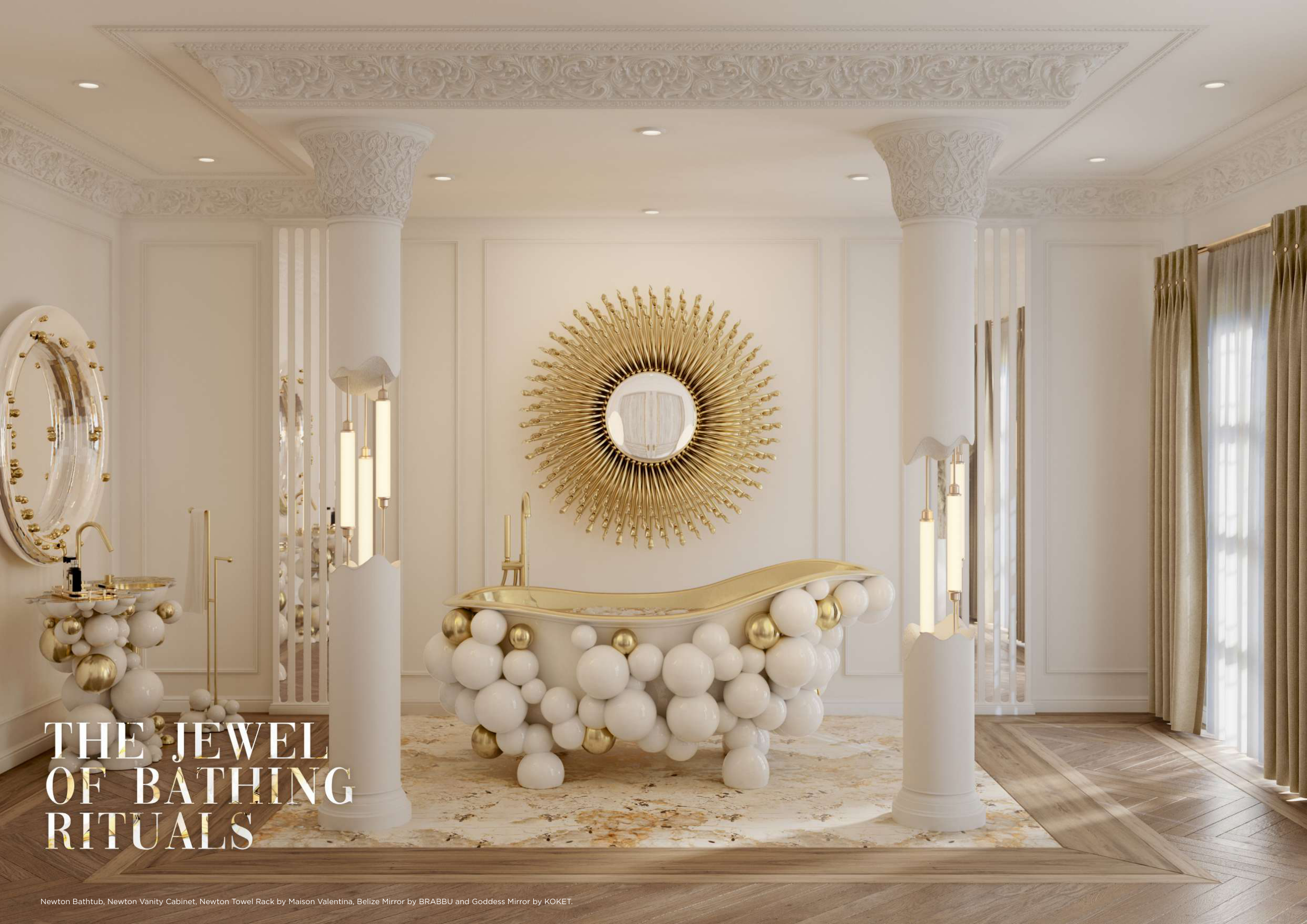 Newton Bathtub, Newton Vanity Cabinet, Newton Towel Rack by Maison Valentina, Belize Mirror by BRABBU and Goddess Mirror by KOKET.
