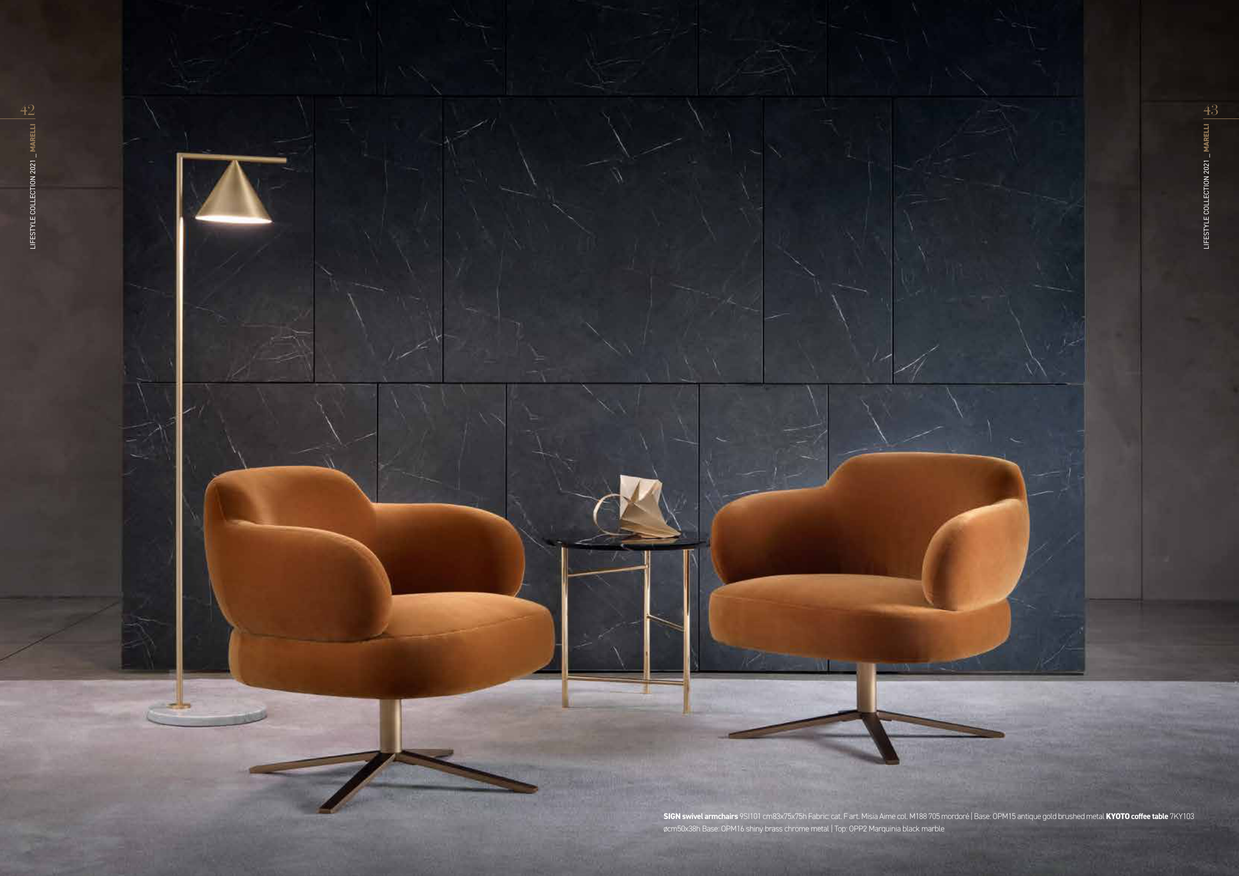 SIGN swivel armchairs 9SI101 cm83x75x75h Fabric: cat. F art. Misia Aime col. M188 705 mordoré | Base: OPM15 antique gold brushed metal KYOTO coffee table 7KY103