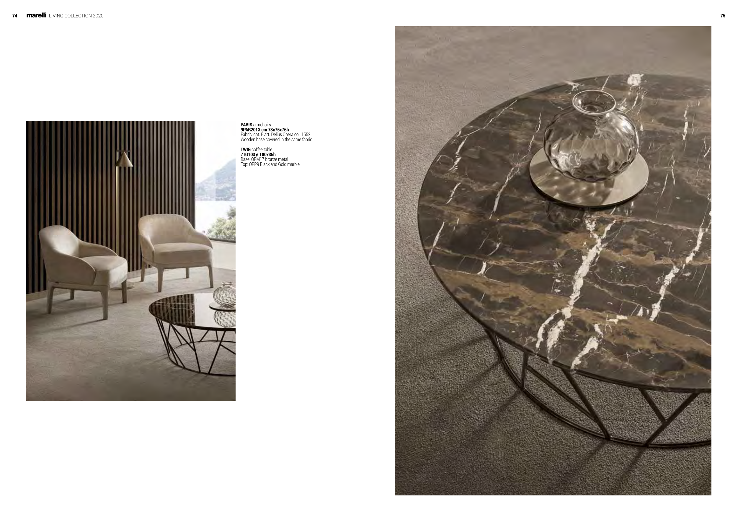 75 marelli LIVING COLLECTION 2020 74 PARIS armchairs 9PAR201X cm 73x75x76h Fabric: cat. E art. Delius Opera col. 1552 Wooden base covered in the same fabric TWIG coffee table 7TG103 ø 100x35h Base: OPM17 bronze metal Top: OPP9 Black and Gold marble