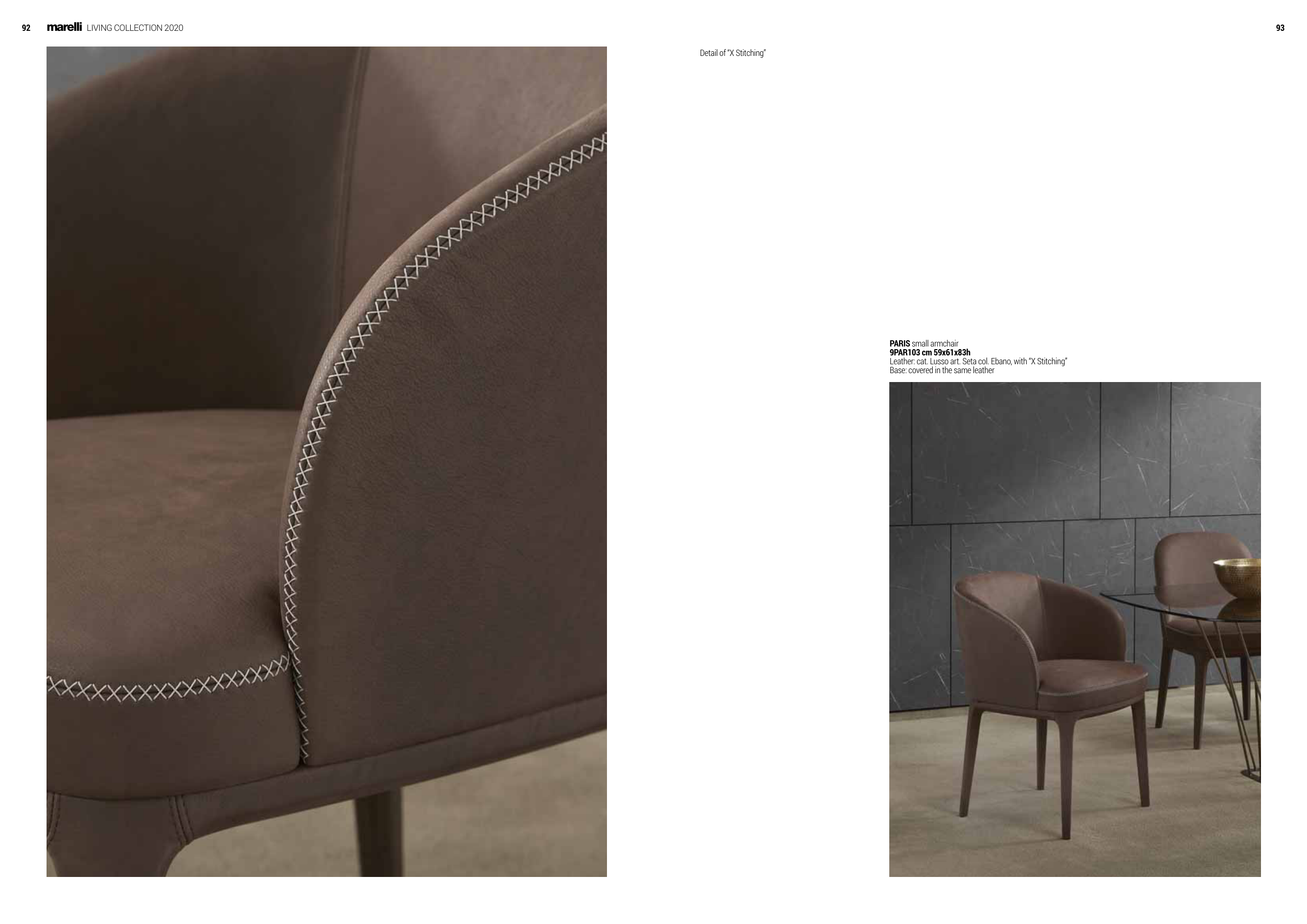 93 marelli LIVING COLLECTION 2020 92 Detail of “X Stitching” PARIS small armchair 9PAR103 cm 59x61x83h Leather: cat. Lusso art. Seta col. Ebano, with “X Stitching” Base: covered in the same leather