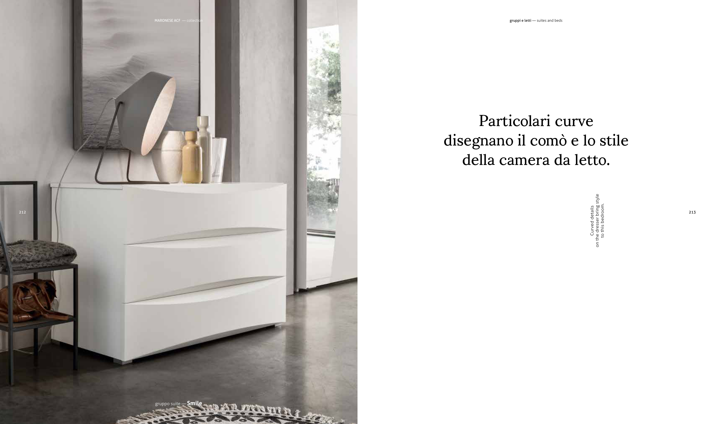 Particolari curve disegnano il comò e lo stile della camera da letto. Curved details on the dresser bring style to this bedroom. gruppo suite — Smile 213 gruppi e letti — suites and beds 212 MARONESE ACF — collection