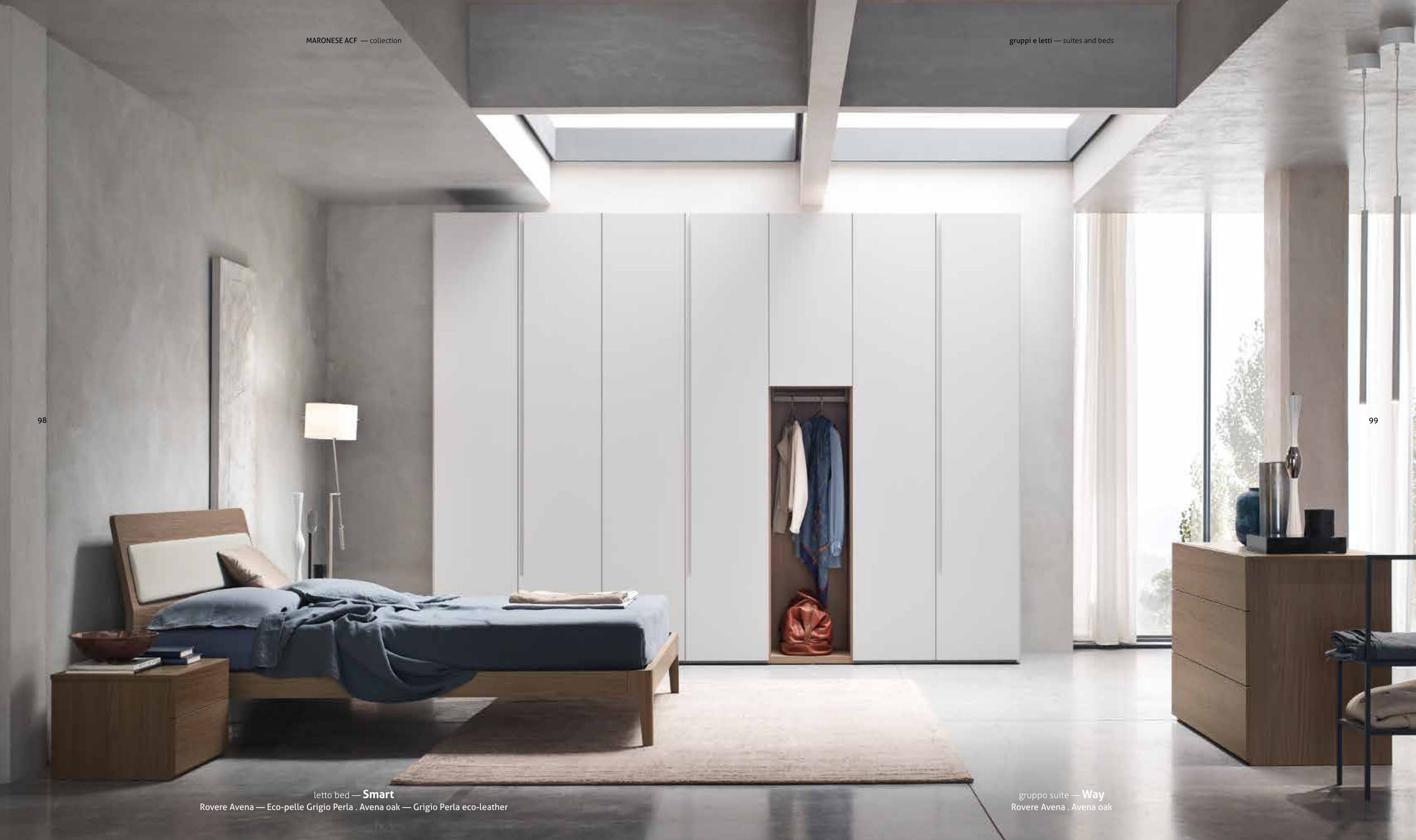 letto bed — Smart Rovere Avena — Eco-pelle Grigio Perla . Avena oak — Grigio Perla eco-leather gruppo suite — Way Rovere Avena . Avena oak 98 99 MARONESE ACF — collection gruppi e letti — suites and beds