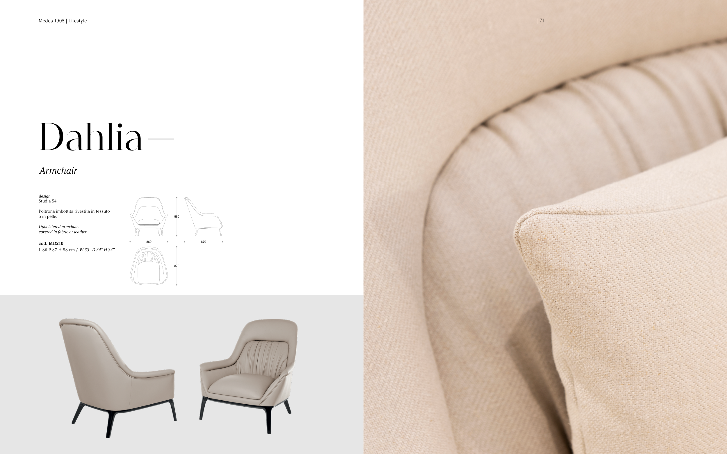 Medea 1905 | Lifestyle 860 880 870 870 design Studia 54 Poltrona imbottita rivestita in tessuto o in pelle. Upholstered armchair, covered in fabric or leather. cod. MD210 L 86 P 87 H 88 cm / W 33’’ D 34’’ H 34’’ Dahlia Armchair | 71