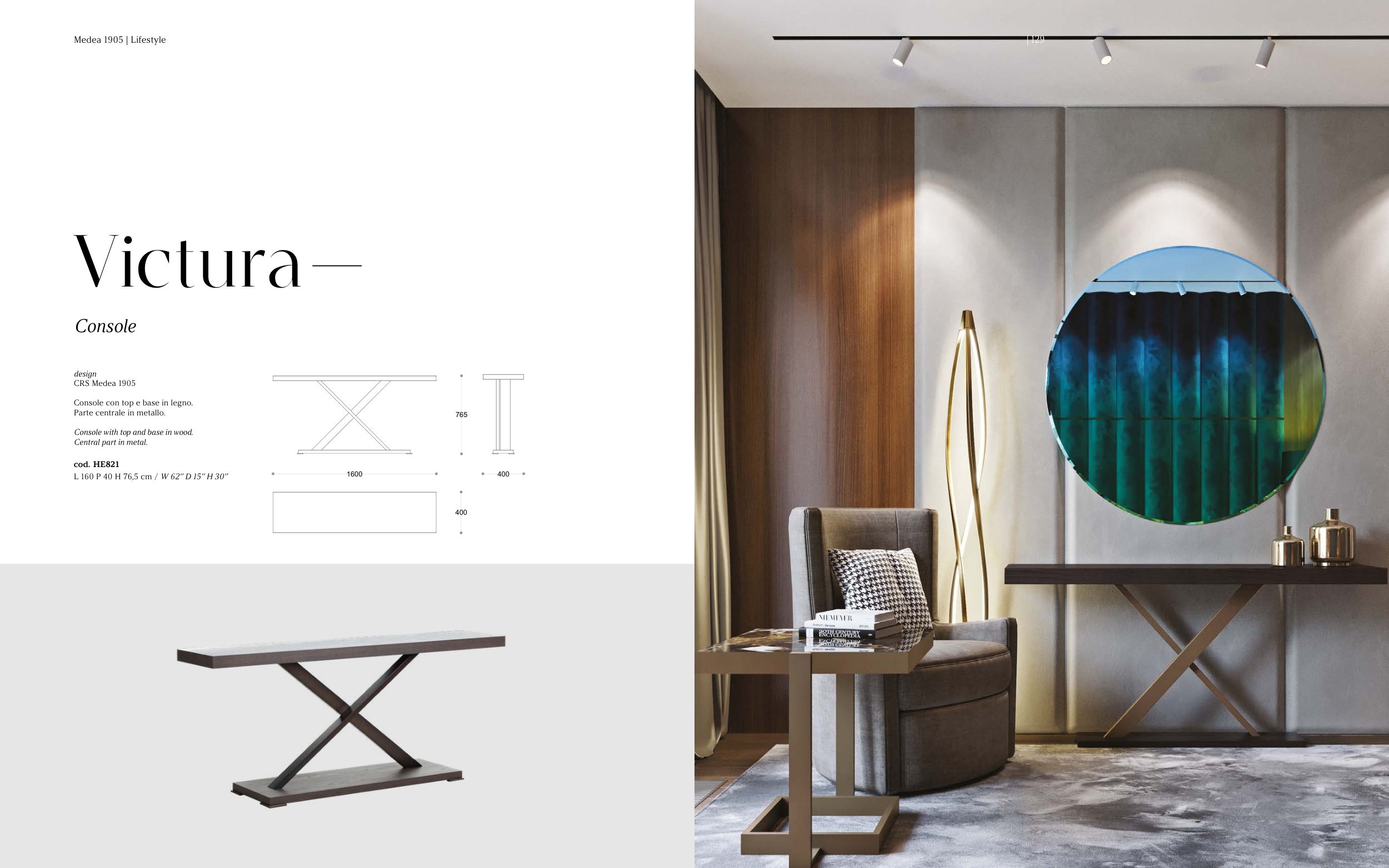 Medea 1905 | Lifestyle 1600 765 400 400 design CRS Medea 1905 Console con top e base in legno. Parte centrale in metallo. Console with top and base in wood. Central part in metal. cod. HE821 L 160 P 40 H 76,5 cm / W 62’’ D 15’’ H 30’’ Victura Console | 129