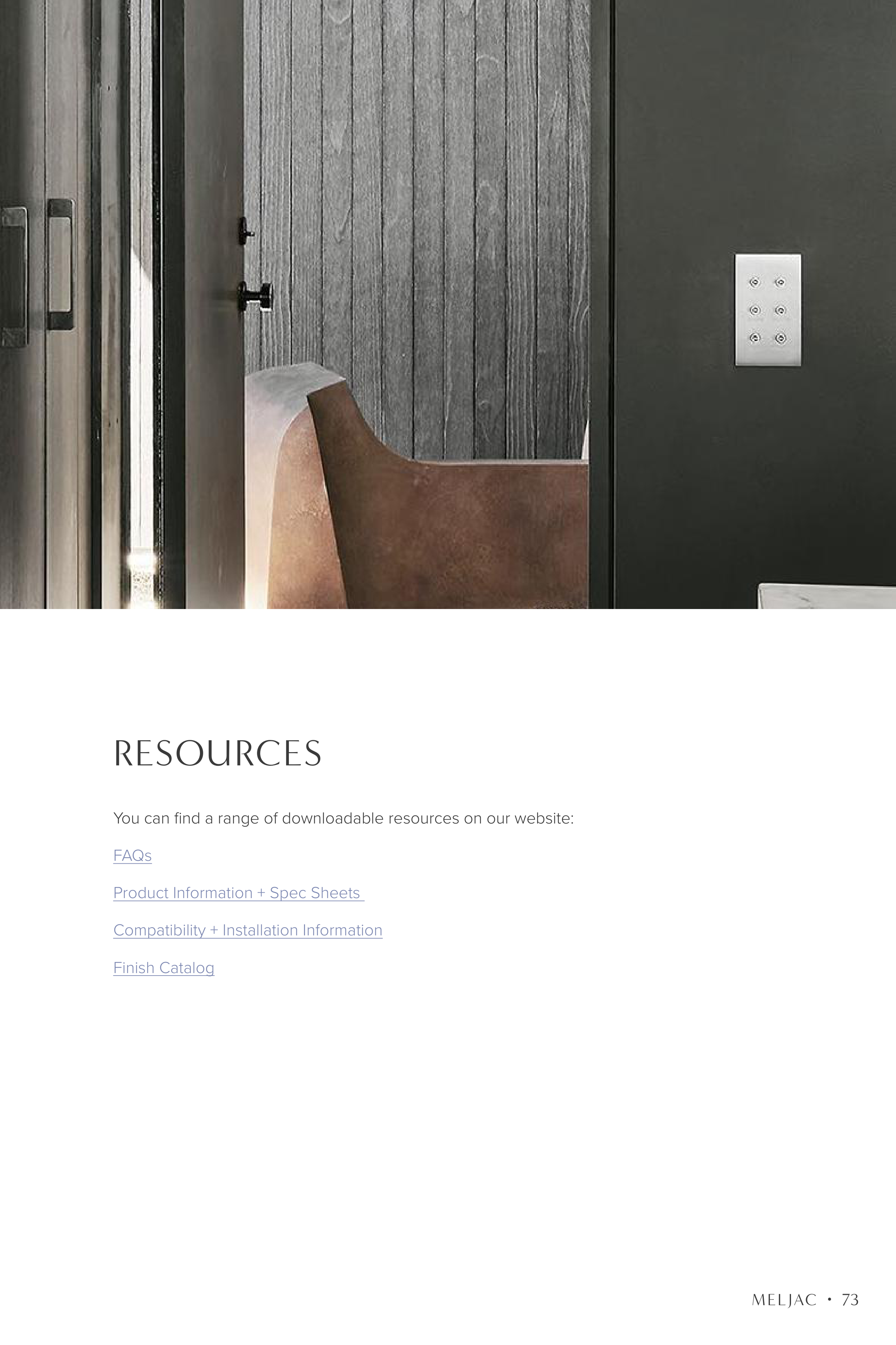 RESOURCES You can find a range of downloadable resources on our website: FAQs Product Information + Spec Sheets Compatibility + Installation Information Finish Catalog 73 MELJAC