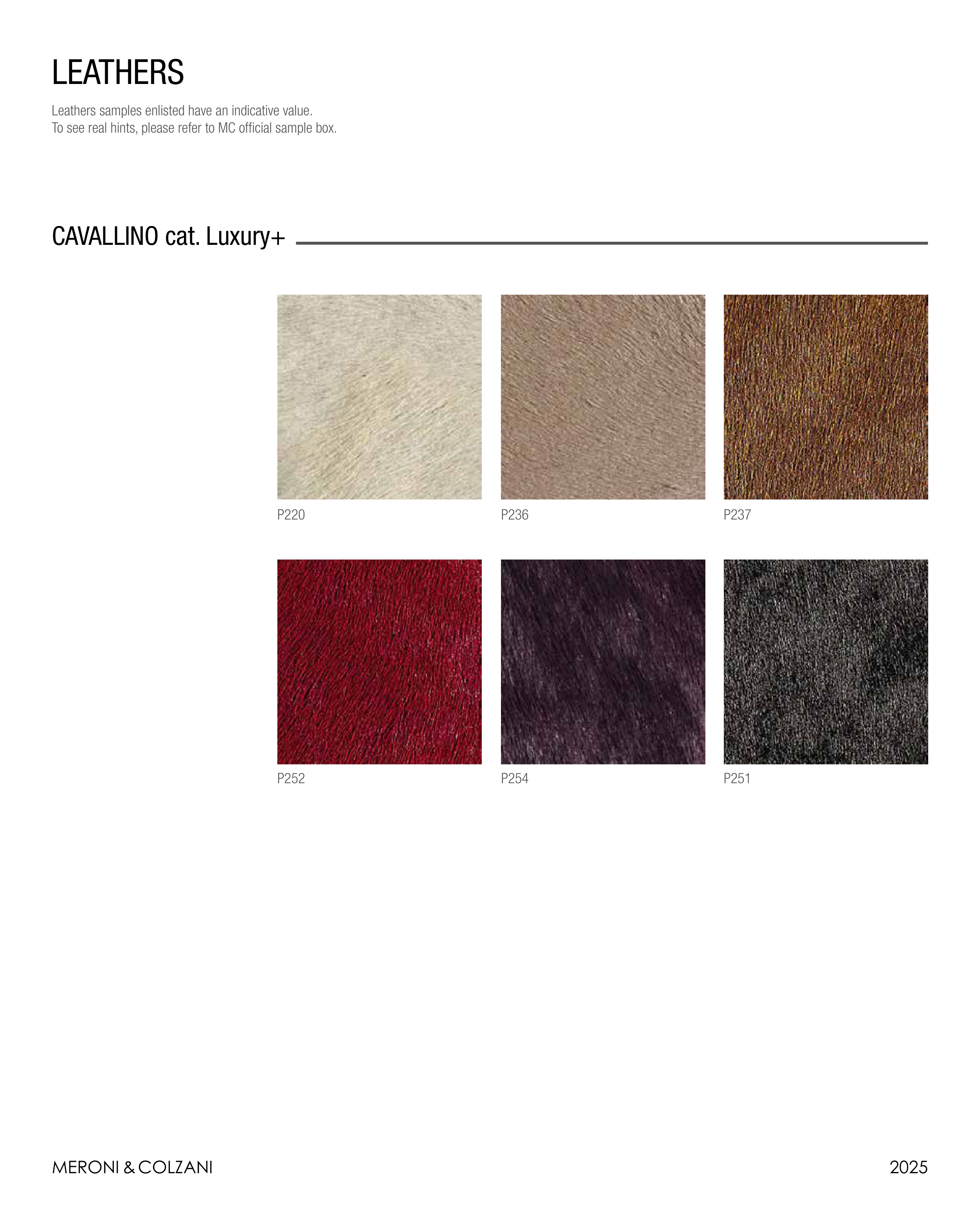 MERONI & COLZANI 2025 CAVALLINO cat. Luxury+ LEATHERS Leathers samples enlisted have an indicative value. To see real hints, please refer to MC official sample box. P220 P236 P237 P251 P254 P252