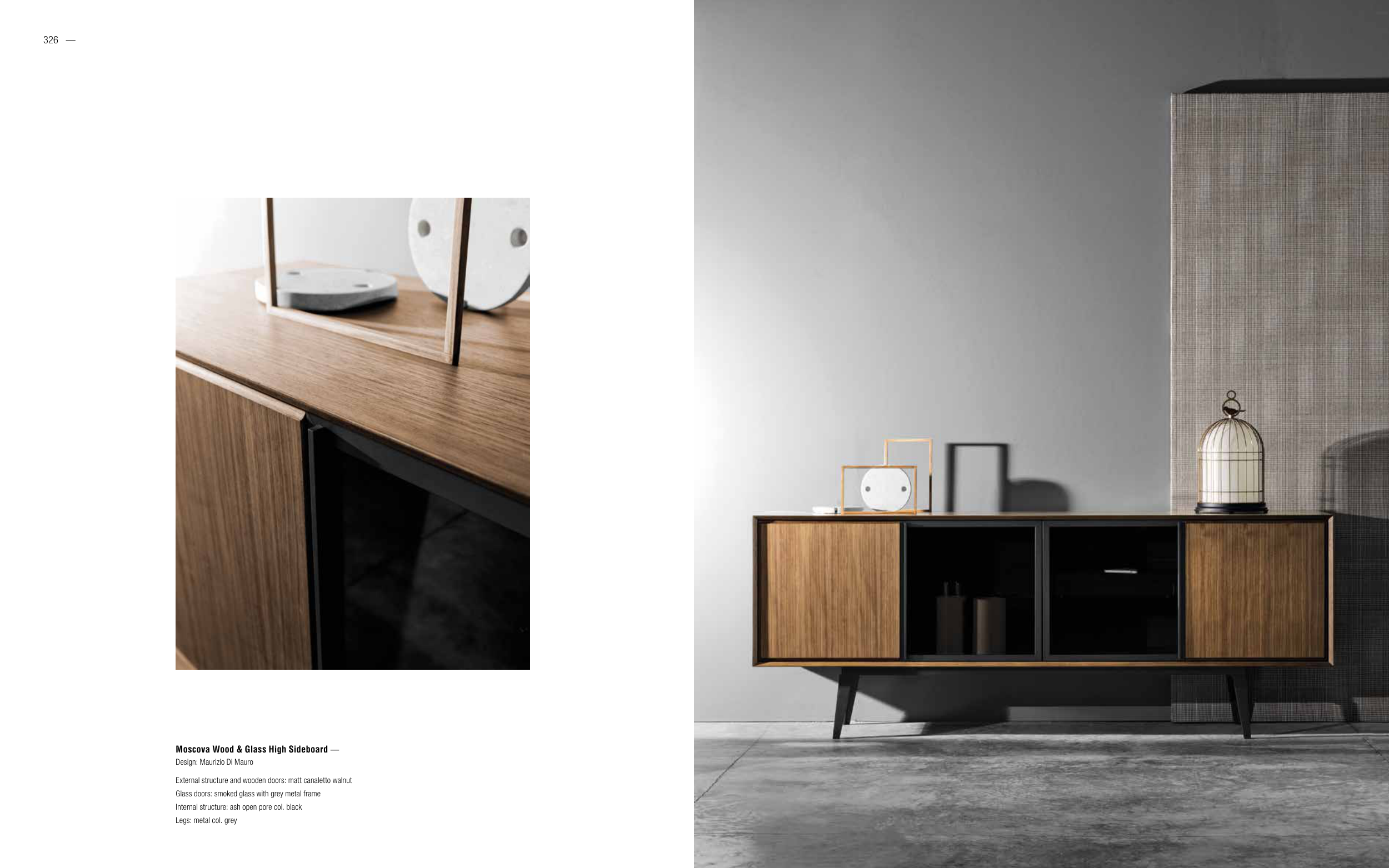 326 — — 327 Moscova Wood & Glass High Sideboard — Design: Maurizio Di Mauro External structure and wooden doors: matt canaletto walnut Glass doors: smoked glass with grey metal frame Internal structure: ash open pore col. black Legs: metal col. grey