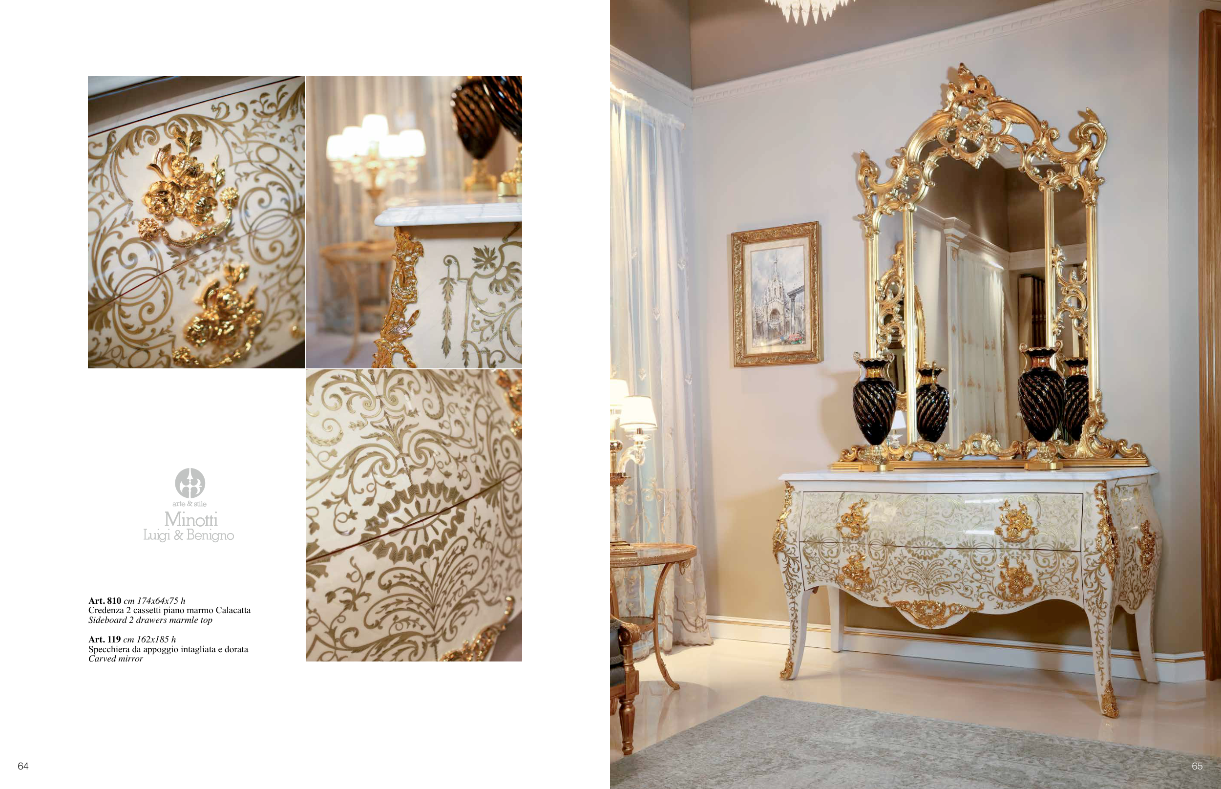 Art. 810 cm 174x64x75 h Credenza 2 cassetti piano marmo Calacatta Sideboard 2 drawers marmle top Art. 119 cm 162x185 h Specchiera da appoggio intagliata e dorata Carved mirror 65 64
