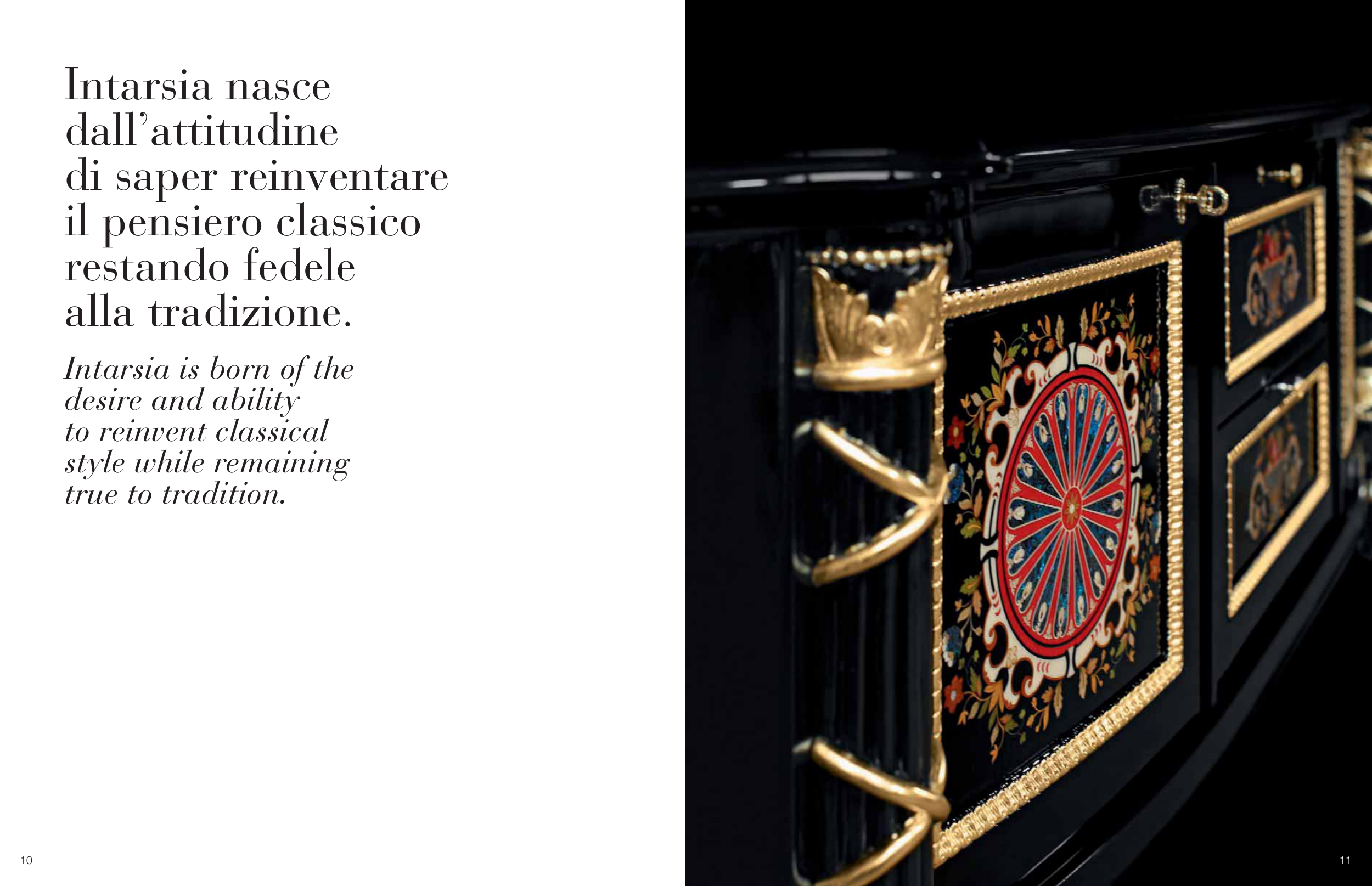 Intarsia nasce dall’attitudine di saper reinventare il pensiero classico restando fedele alla tradizione. Intarsia is born of the desire and ability to reinvent classical style while remaining true to tradition. 11 10