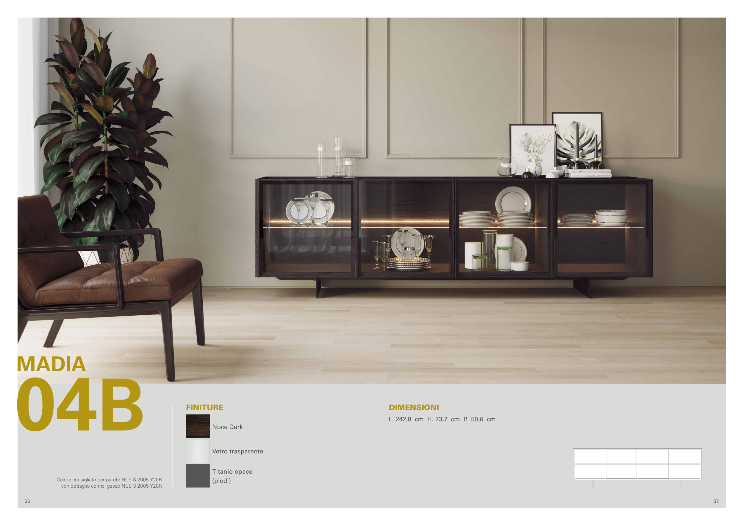 37 36 04B MADIA DIMENSIONI L. 242,8 cm H. 73,7 cm P. 50,6 cm FINITURE Colore consigliato per parete NCS S 2005-Y20R con dettaglio cornici gesso NCS S 2005-Y20R Vetro trasparente Titanio opaco (piedi) Noce Dark