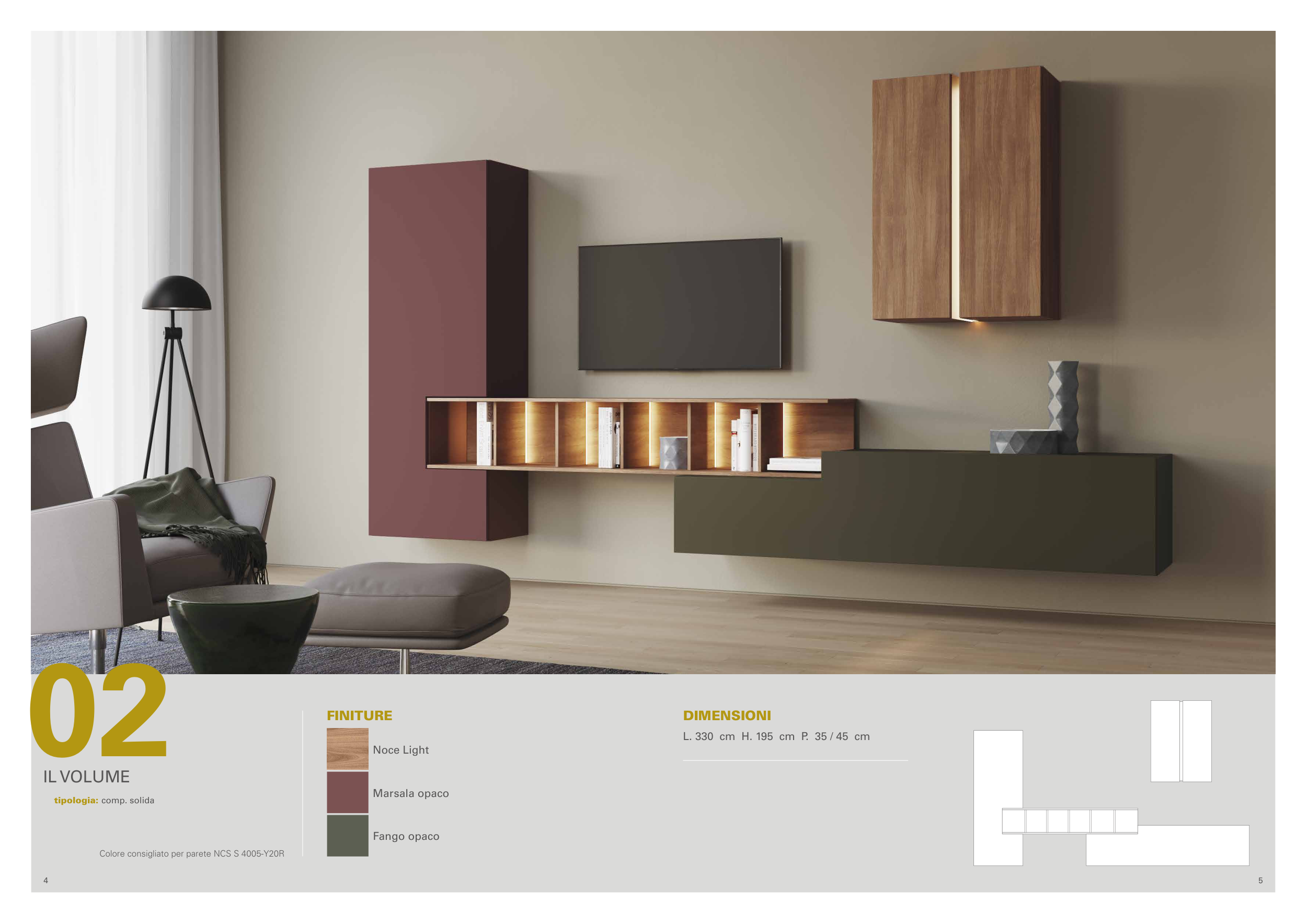5 4 02 DIMENSIONI L. 330 cm H. 195 cm P. 35 / 45 cm FINITURE tipologia: comp. solida Colore consigliato per parete NCS S 4005-Y20R IL VOLUME Noce Light Marsala opaco Fango opaco