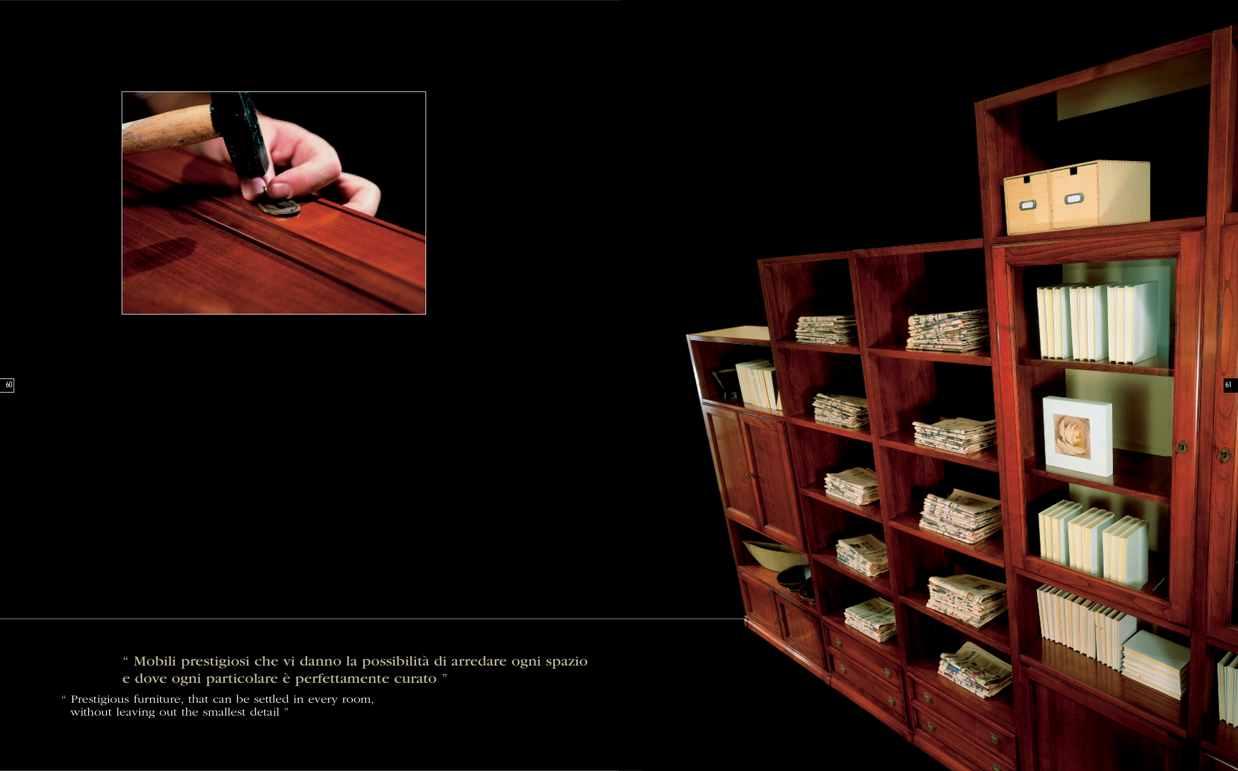 61 60 “ Prestigious furniture, that can be settled in every room, without leaving out the smallest detail ” “ Mobili prestigiosi che vi danno la possibilità di arredare ogni spazio e dove ogni particolare è perfettamente curato ”