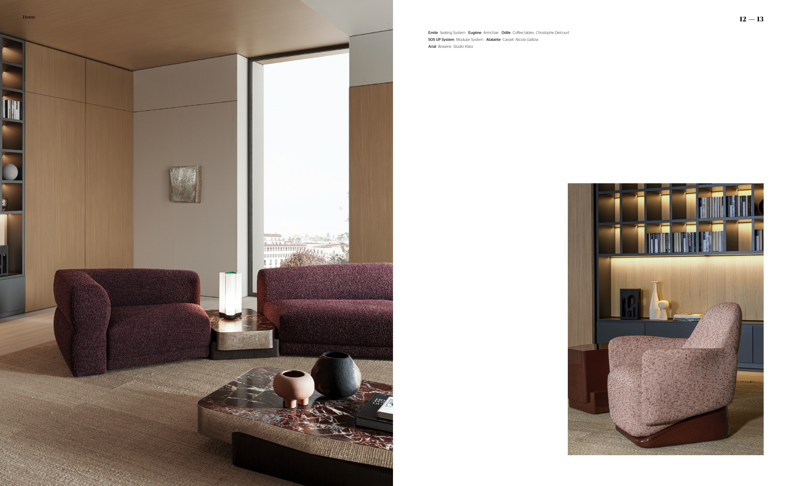 Home 12 — 13 Emile Seating System Eugène Armchair Odile Coffee tables Christophe Delcourt 505 UP System Modular System Atalante Carpet Nicola Gallizia Arial Boiserie Studio Klass