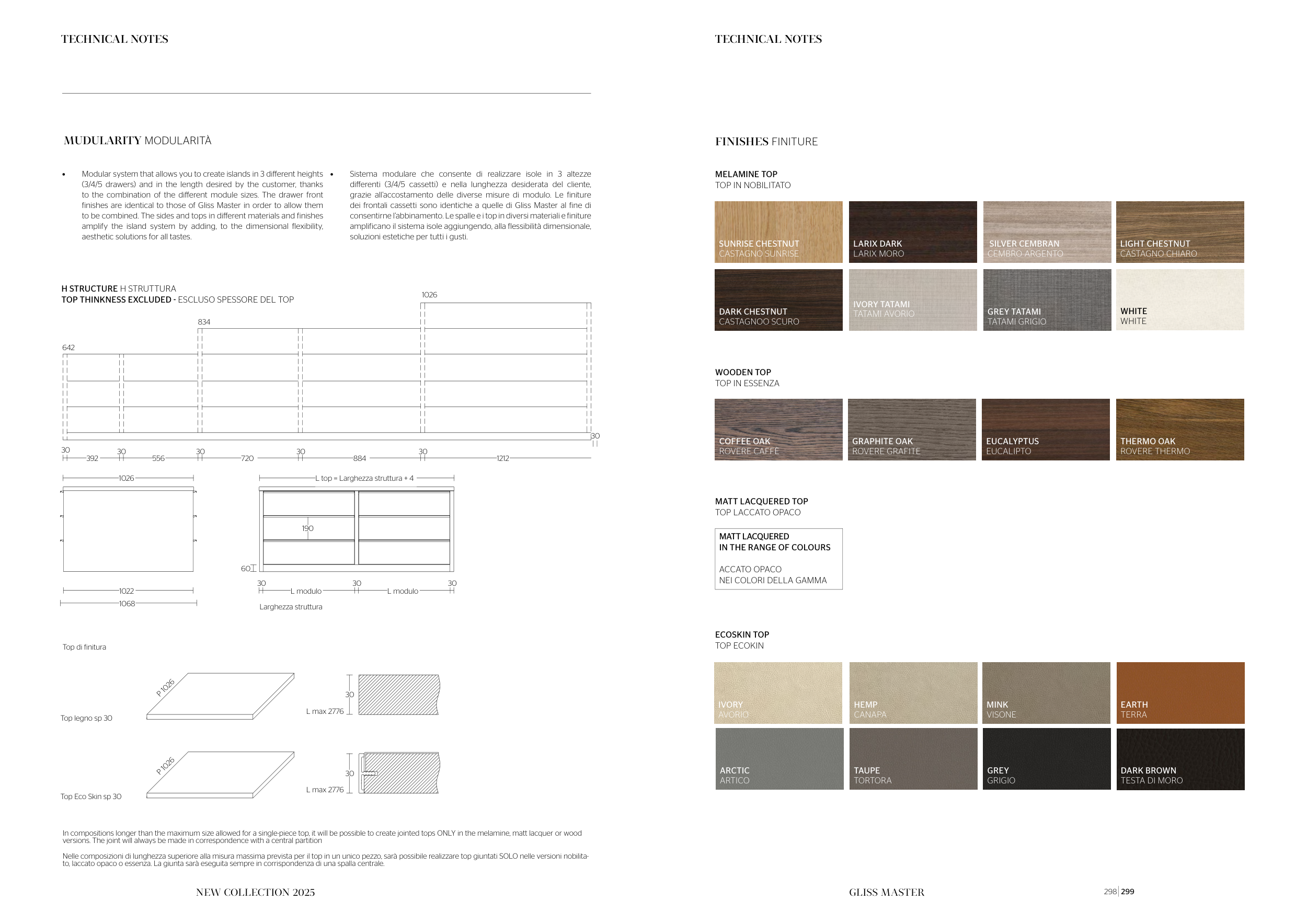 In compositions longer than the maximum size allowed for a single-piece top, it will be possible to create jointed tops ONLY in the melamine, matt lacquer or wood