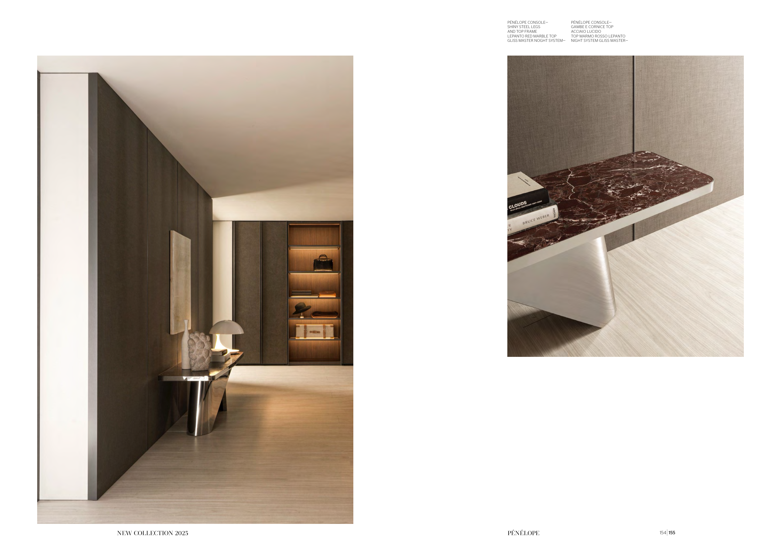 154 155 NEW COLLECTION 2025 PÉNÉLOPE PÉNÉLOPE CONSOLE— SHINY STEEL LEGS AND TOP FRAME LEPANTO RED MARBLE TOP GLISS MASTER NOGHT SYSTEM— PÉNÉLOPE CONSOLE— GAMBE E CORNICE TOP ACCIAIO LUCIDO TOP MARMO ROSSO LEPANTO NIGHT SYSTEM GLISS MASTER—